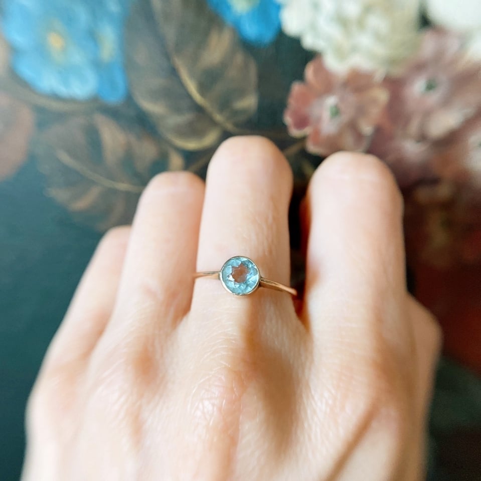 淡いアクアブルーの絵具を一滴溶かして、広がりをみせるように、空色の柔らかなスカイブルー色が美しいシンプルなアクアマリンリング。