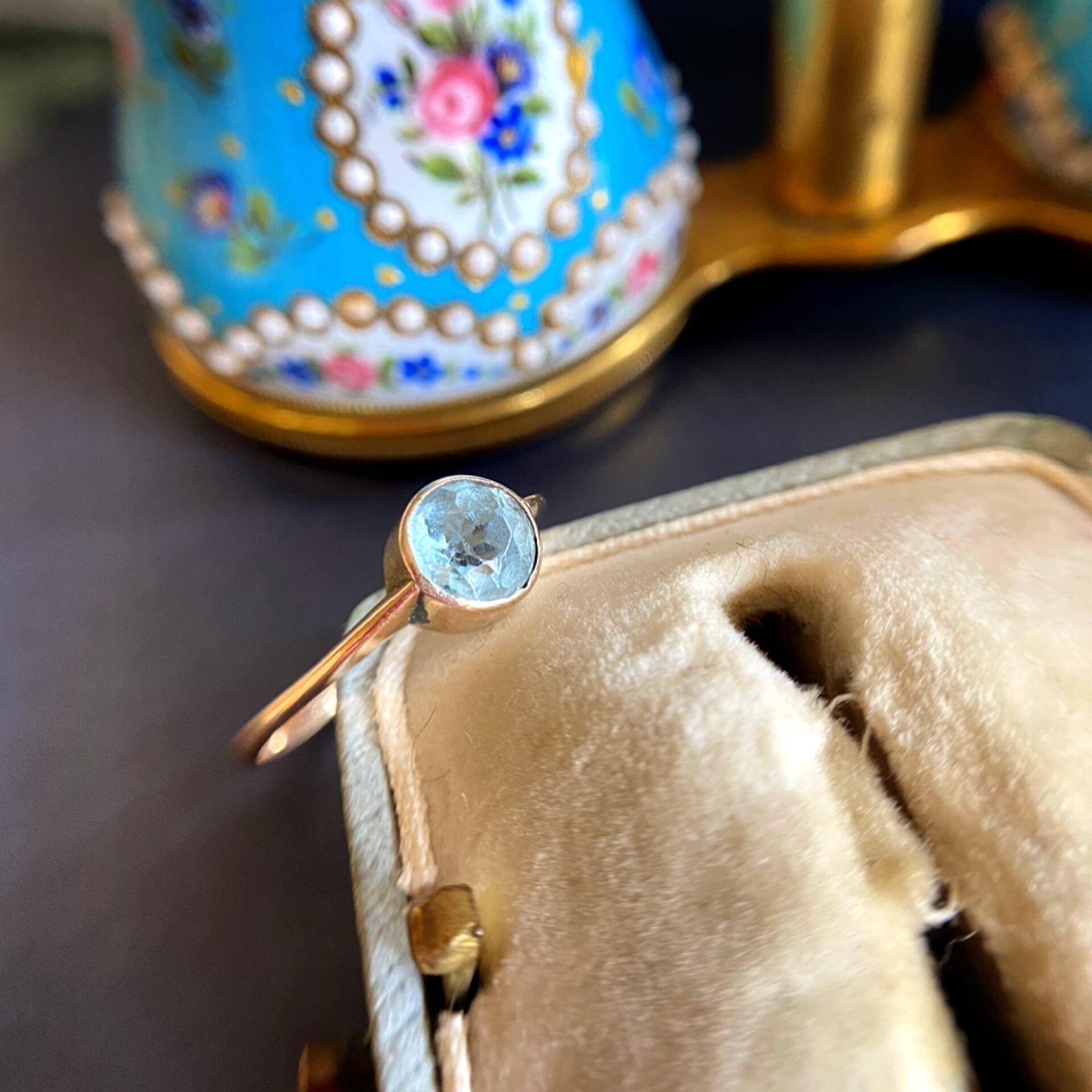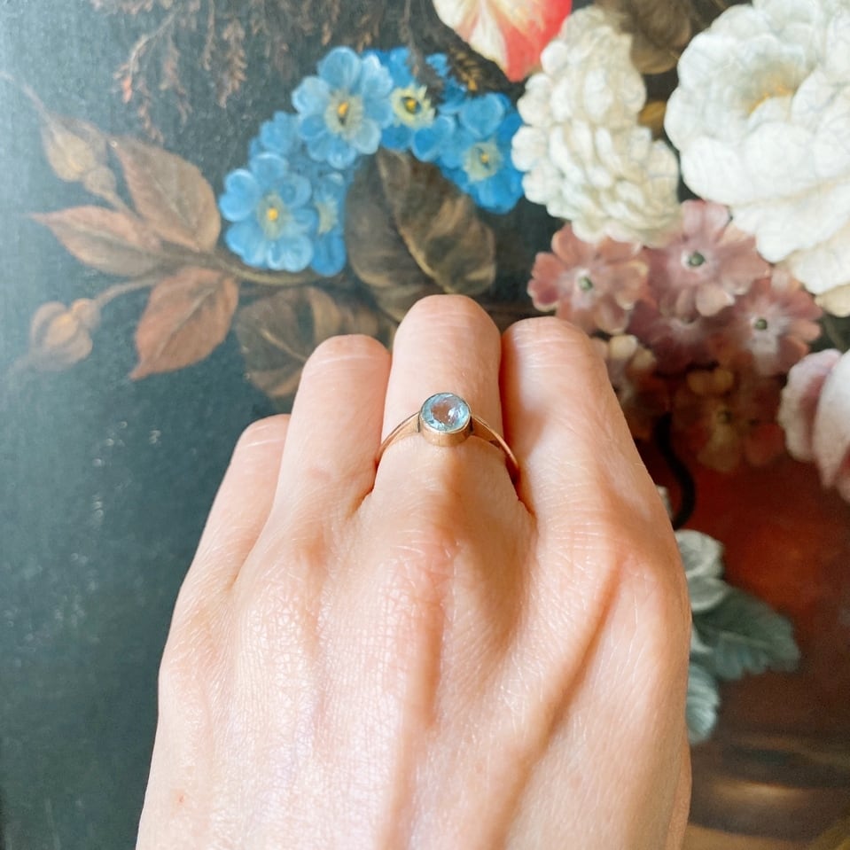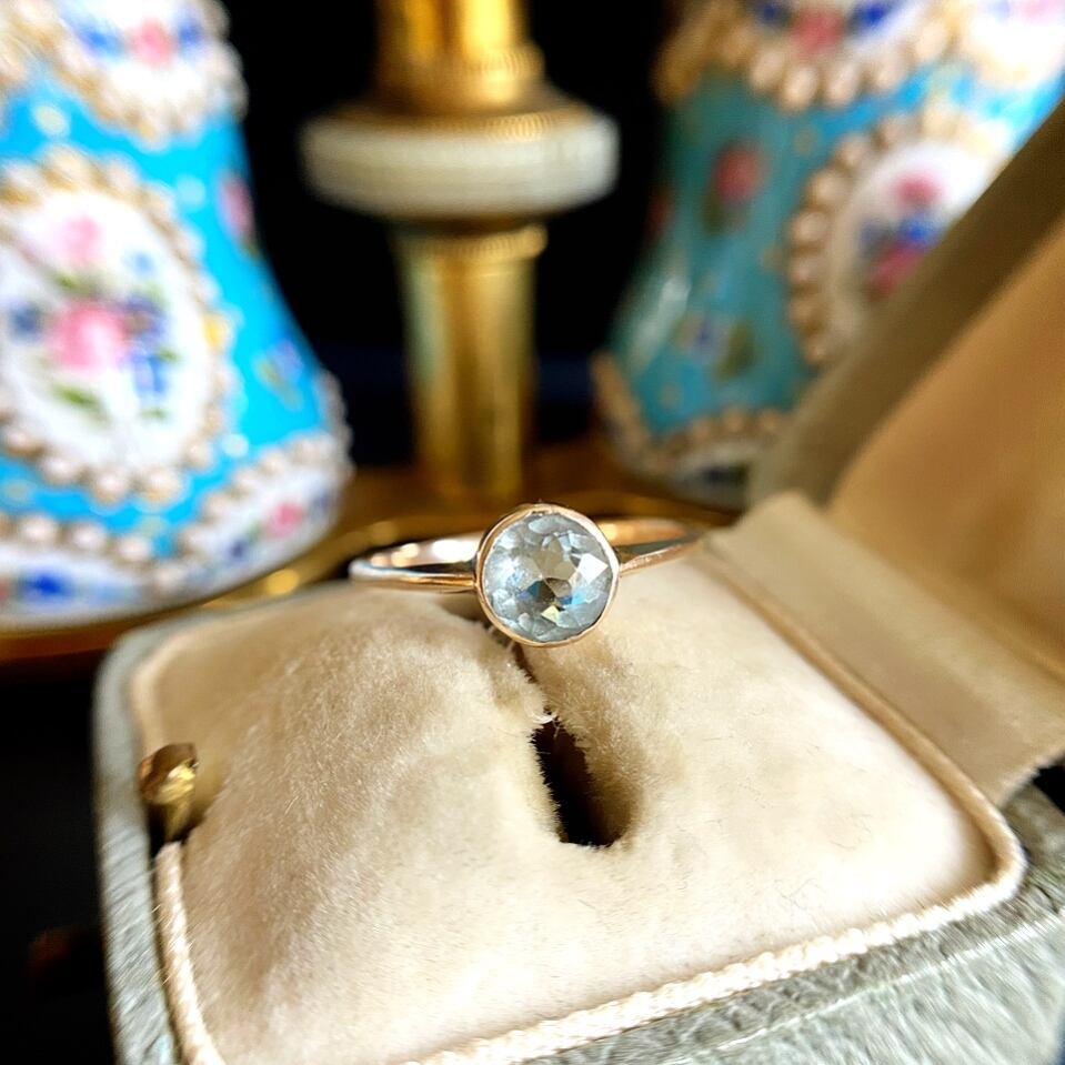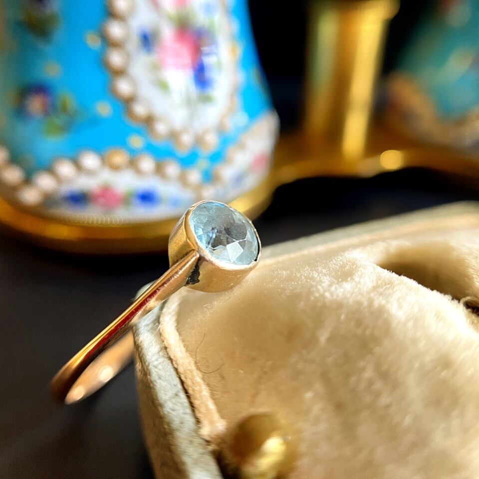 アクアマリンの水色は、海や空のシンボリックでもあり、ヨーロッパで好まれる石の一つでもありす。その昔、アクアマリンを海に投げると荒れた海が鎮まると言う言い伝えがあったように、穏やかな静けさを感じるリングは覆輪留めでセットされ、コロンとしたオールドカットも魅力的ですね。