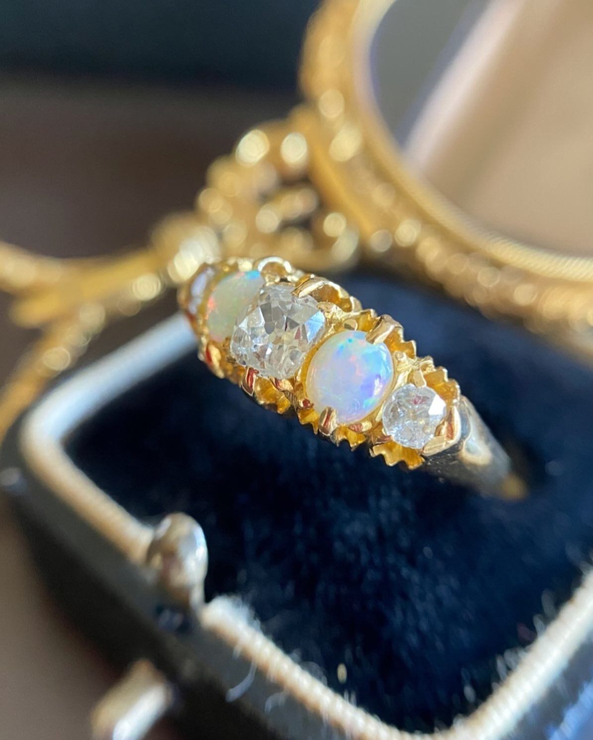 南極の氷のかけらのような透明感のあるオールドマインカットダイヤモンドを中心に、その氷を挟むようにして南極のオーロラのように幻想的な様々な色をみせてくれる2石のオパール、そしてその隣りには2石のオールドマインカットダイヤモンドをセットしたなんとも言えない美しさを纏ったヴィクトリアンリング。
