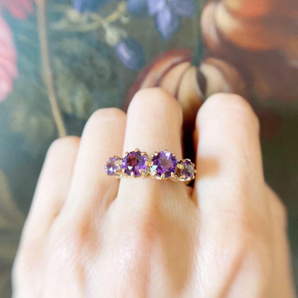 贅沢にも約6.5mmという大粒の濃いアメシストを中心に2石、両端には約4.8mmの少し薄めの柔らかな色合いのアメシストを2石、8本の爪を使って、宝石を包みこむようにホールドし、爪自体がデザインの一部として存在している事が凄くカッコ良いひと品です。