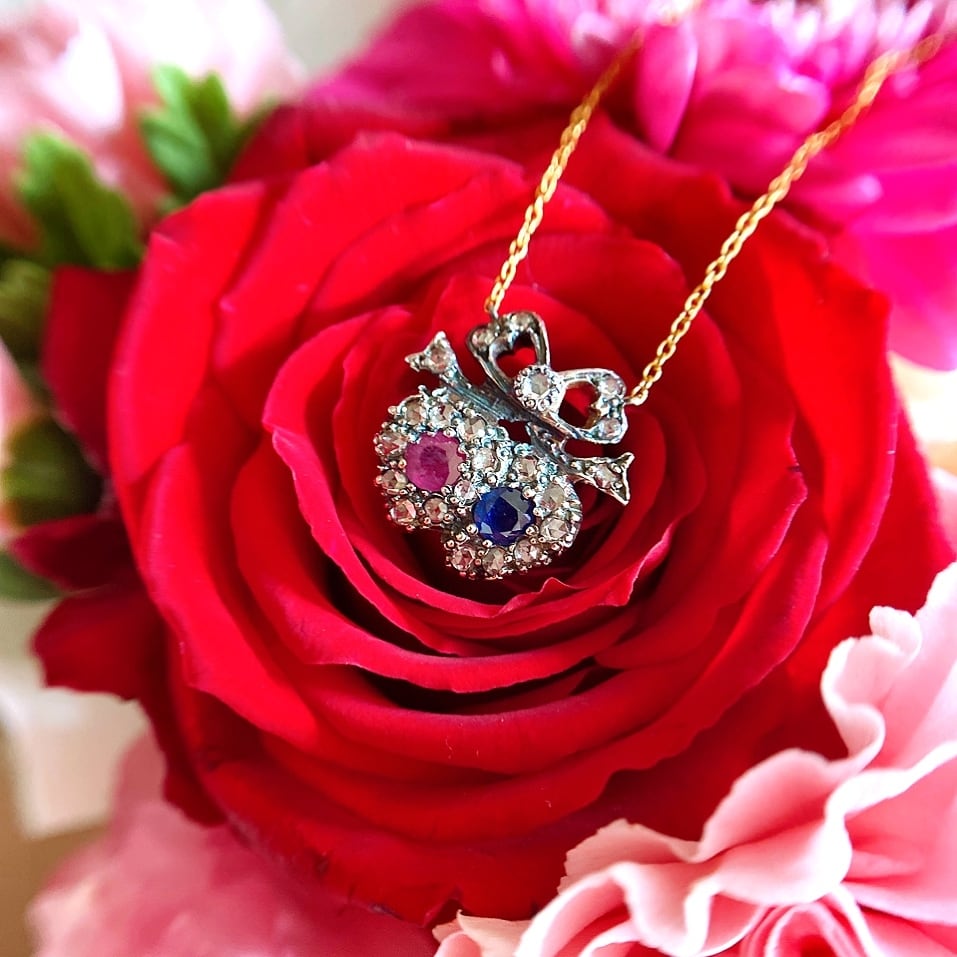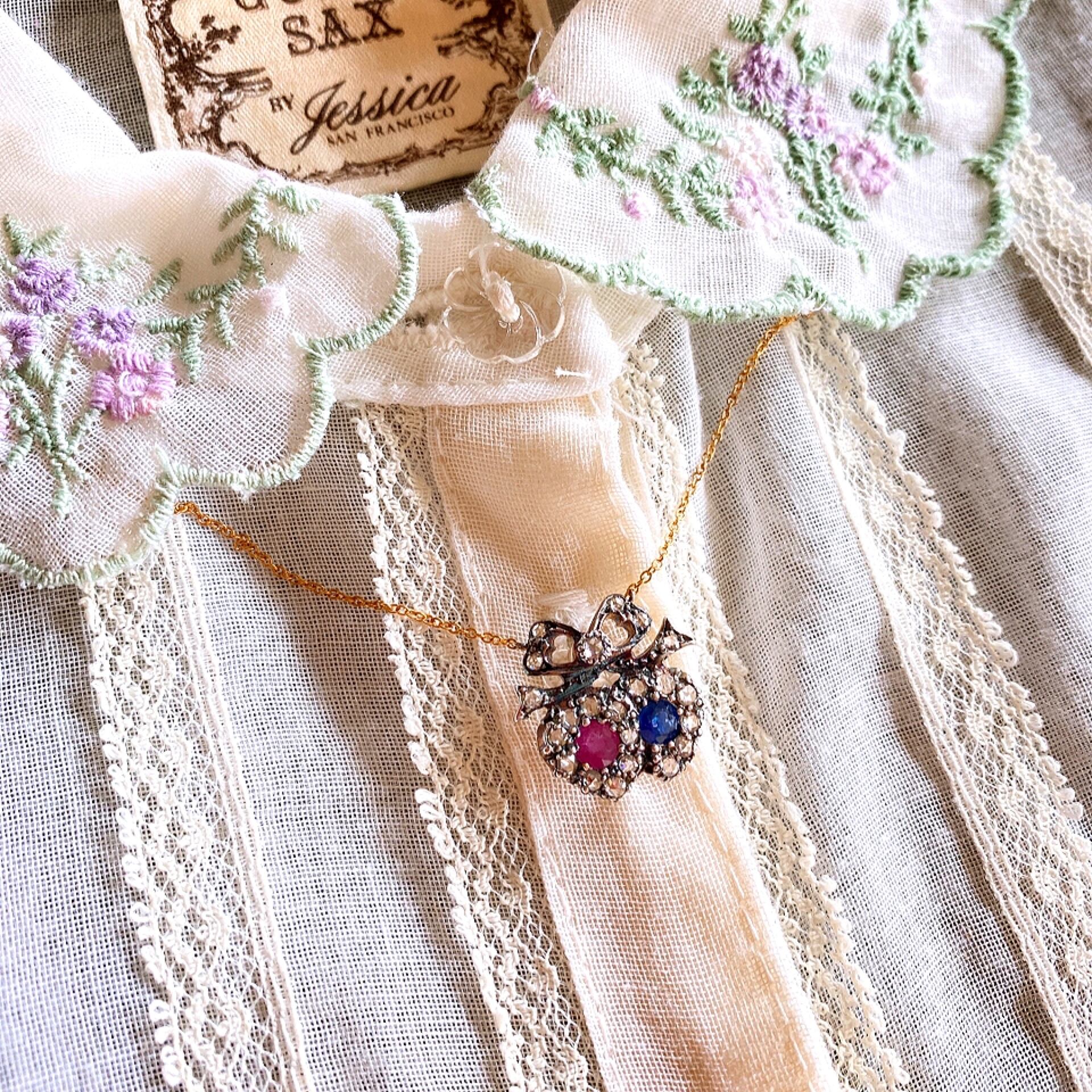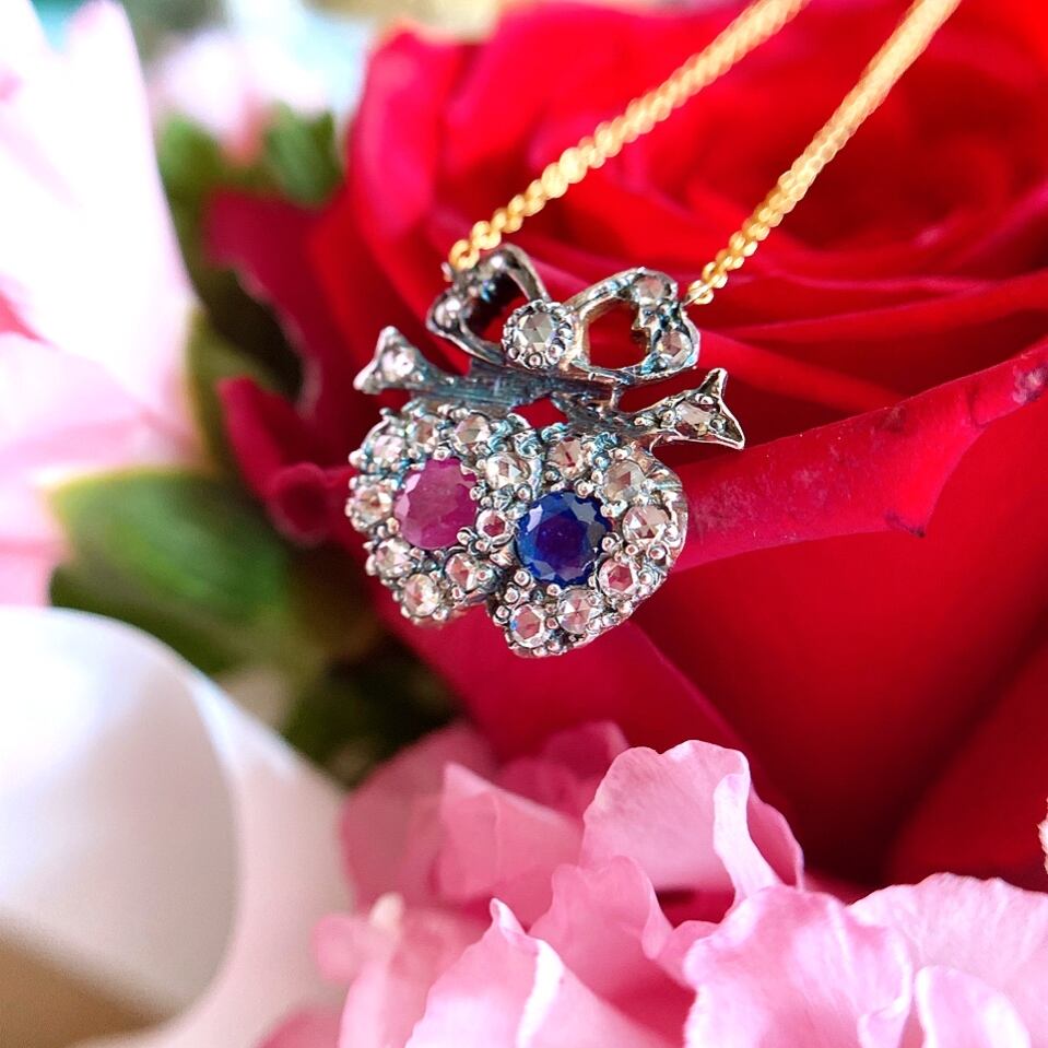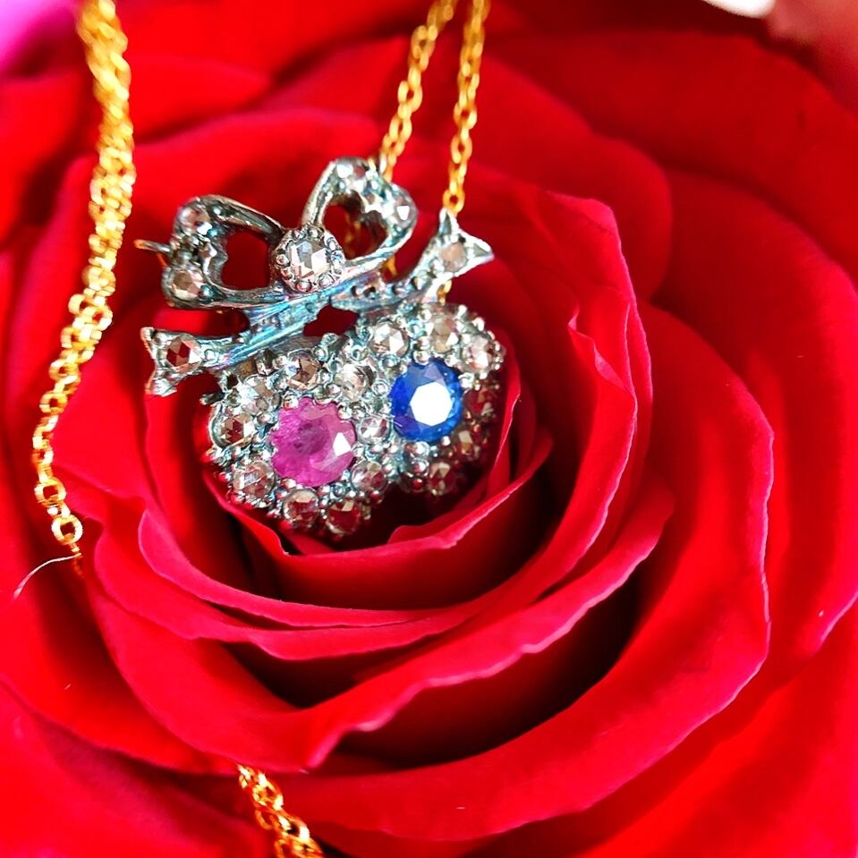 ブルーベリーのようなサファイアとクランベリーのようなローズピンク色のルビーをそれぞれシルバーのハート型の台座にセットし、取り巻きにはローズカットダイヤモンドを散りばめ、ハートの上にはリボンをキュッと添えた何とも愛らしいヴィクトリアン時代のペンダントネックレス。