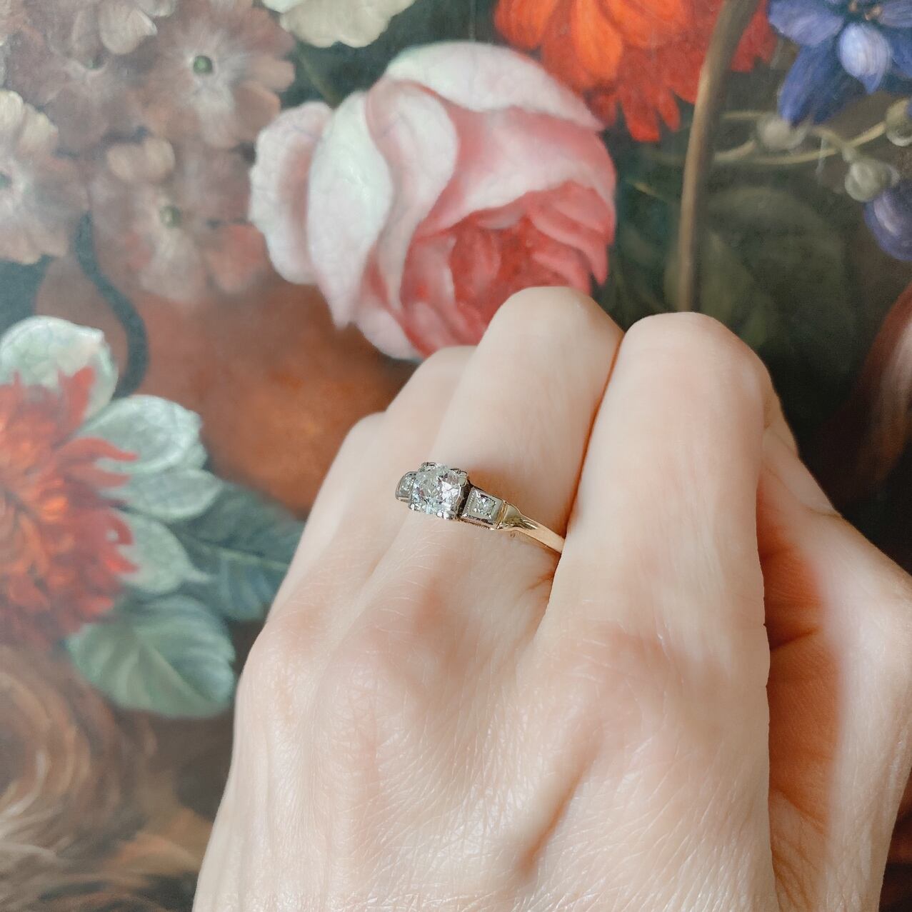 四角い台座に溢れんばかりに誇らしげにセットされたオールドヨーロピアンカットのソリテールリング。