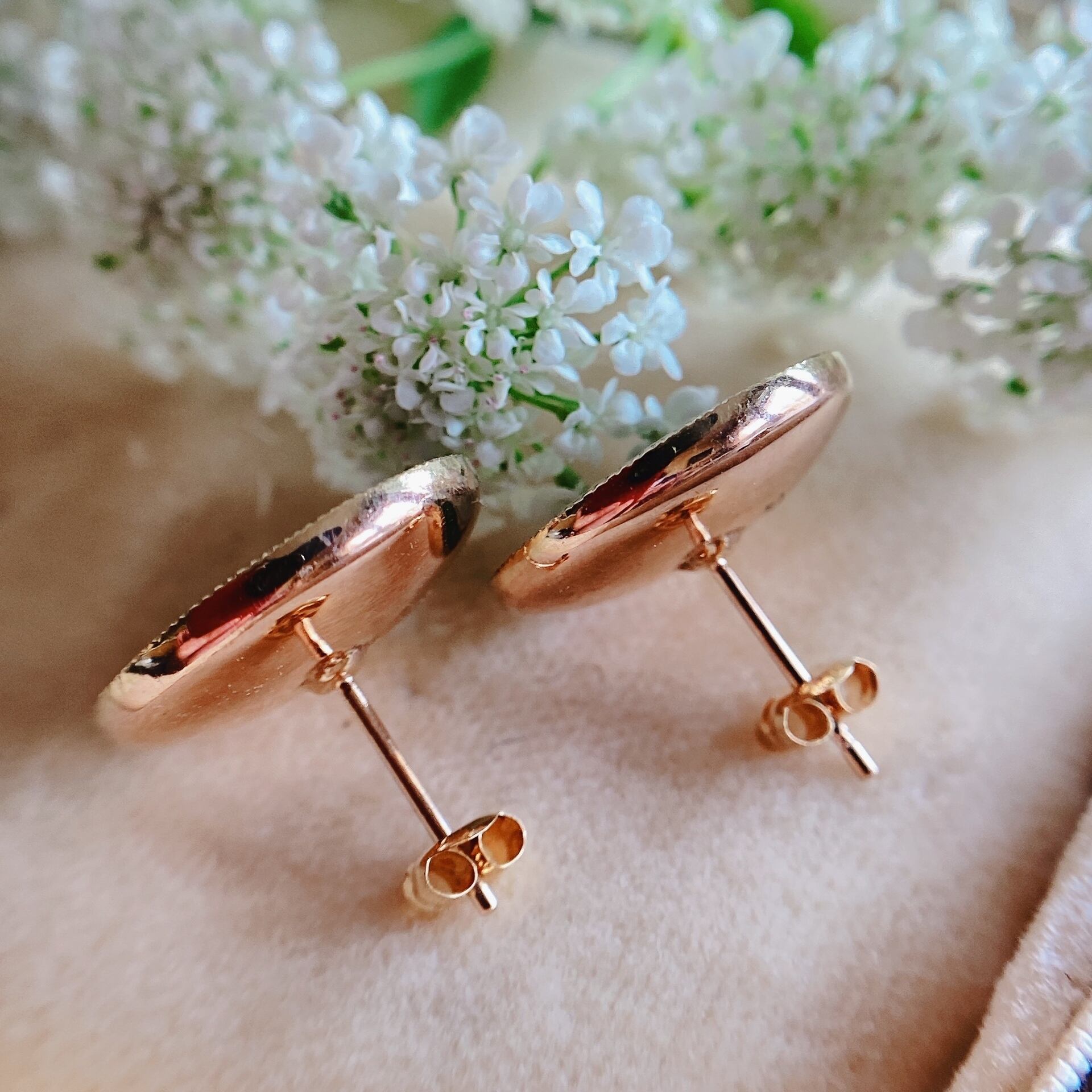 ※ マザーオブパール、エナメル共にコンディションは良好です。 但し、写真にもありますように一つのピアスの方は少しマザーオプパールが変色している部分がございます。気になるほどの変色ではございません。100年程前の古いお品と考えましたら充分に美しく残ってくれたと思います。