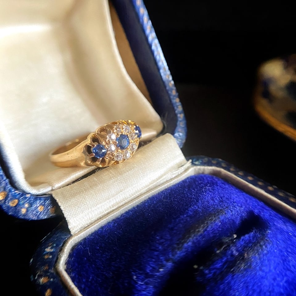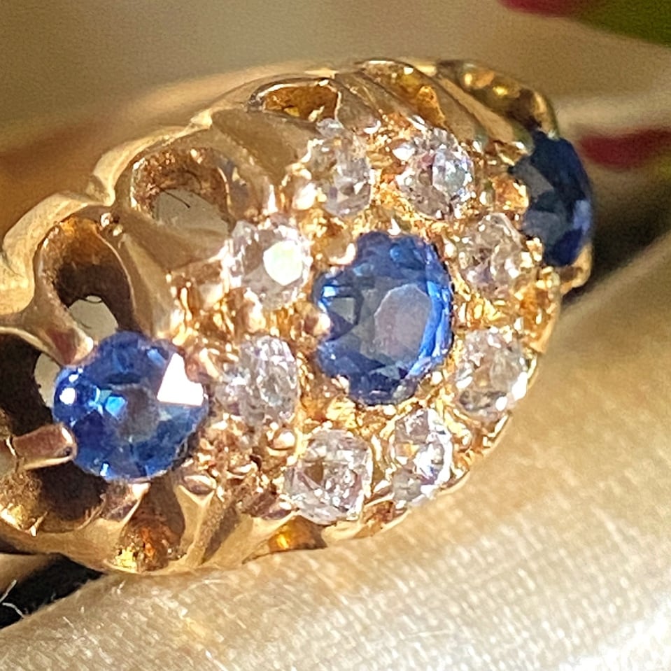 ブルーサファイア&オールドマインカットダイヤモンドクラスタースリーストーンエドワーディアンリング