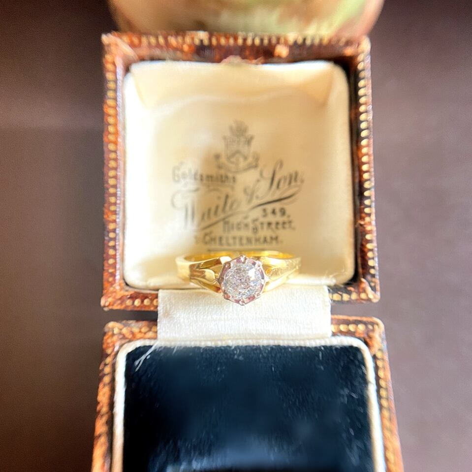 一瞬ダイヤモンドの大きさが掴みにくくなっていて、現代のようにダイヤモンドを立て爪でセットする方法とは違う、石の大きさを目立たせるのではないこのような奥ゆかしいセッティング方法は、まさにアンティークならではです。