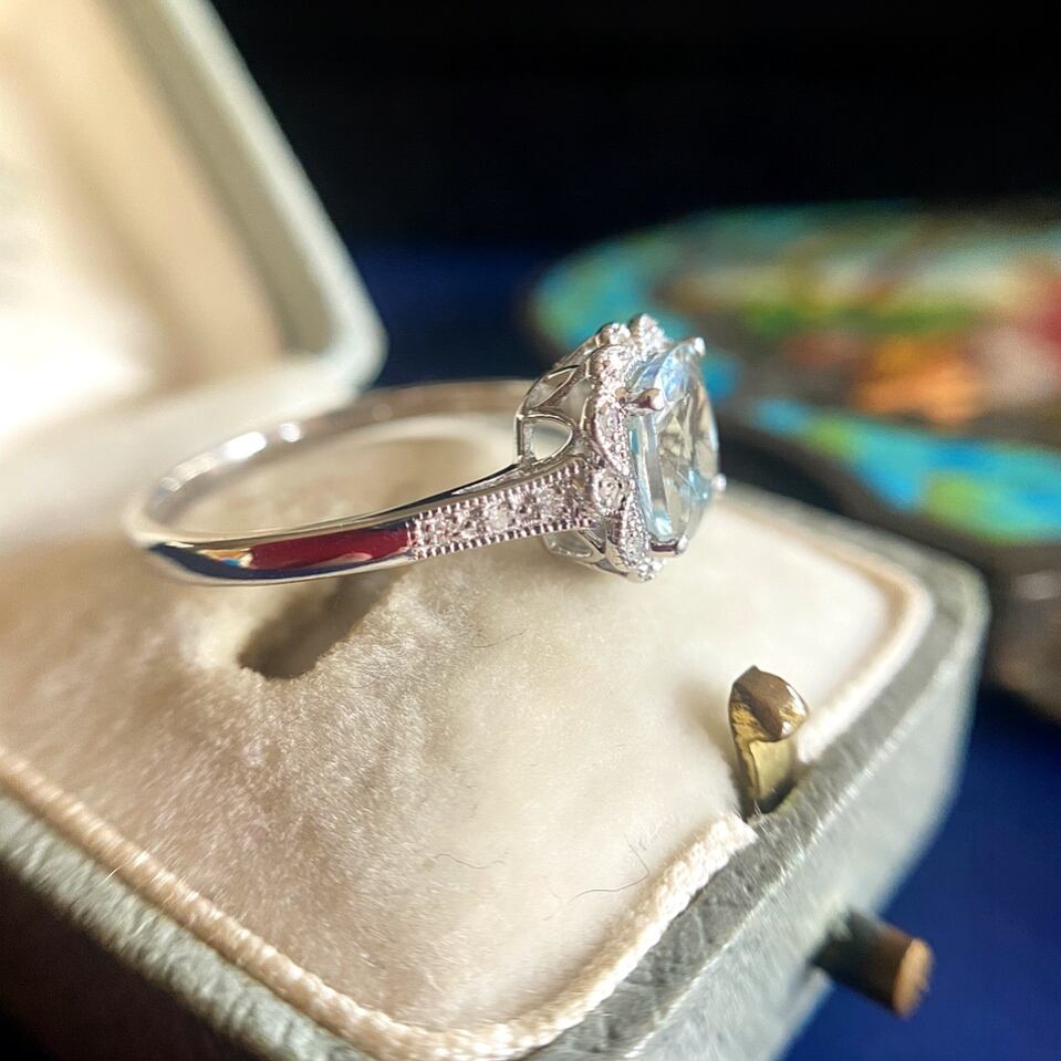 その昔、アクアマリンを海に投げると荒れた海が鎮まると言う言い伝えがあったように、こちらのリングをただただ見ているだけでも穏やかな気持ちになるので不思議ですね。