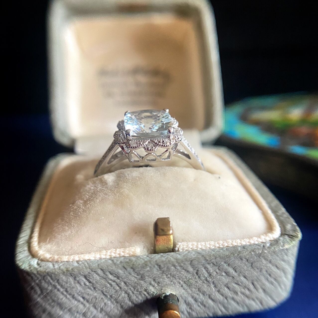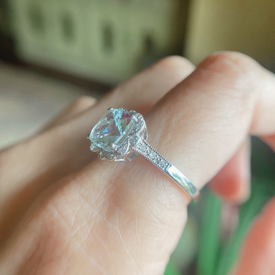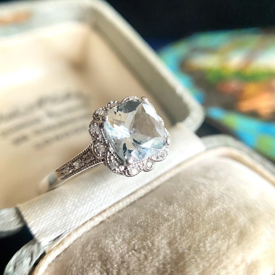 瑞々しく、清涼感のあるクリアブルーが魅力的なクッションシェープのアクアマリンのフラワーリング。