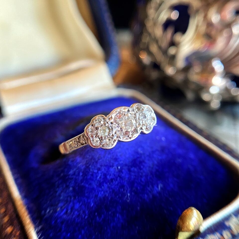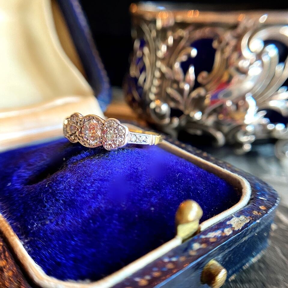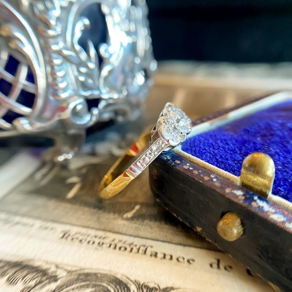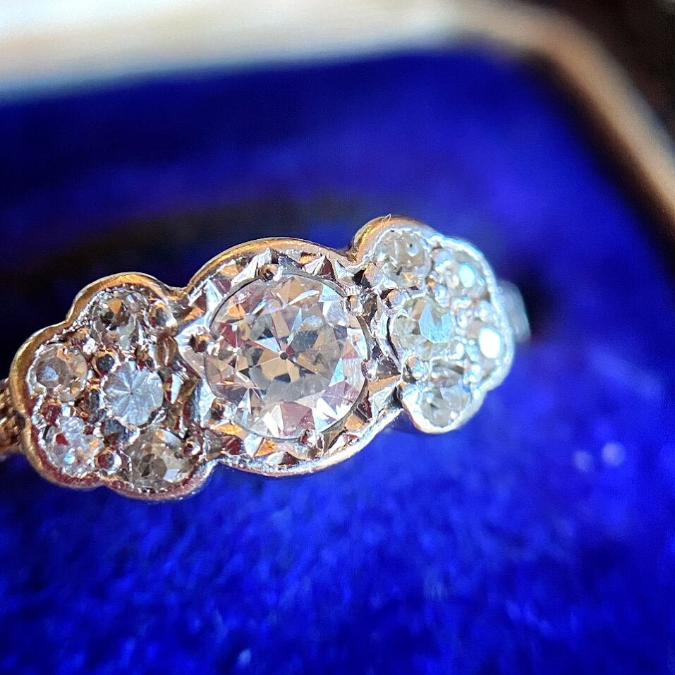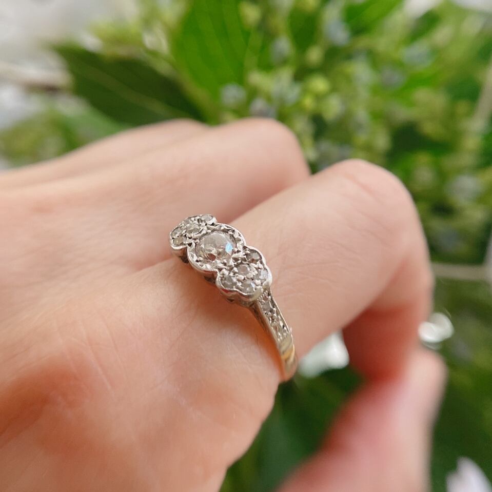 ダイヤモンドのキャンディのような可愛らしいオールドヨーロピアンカットダイヤモンドのリング。でもよく見ると実はフラワーデザインになっているのですよ。