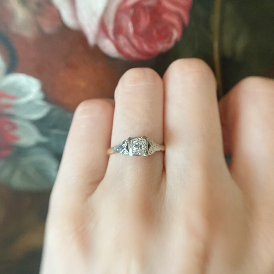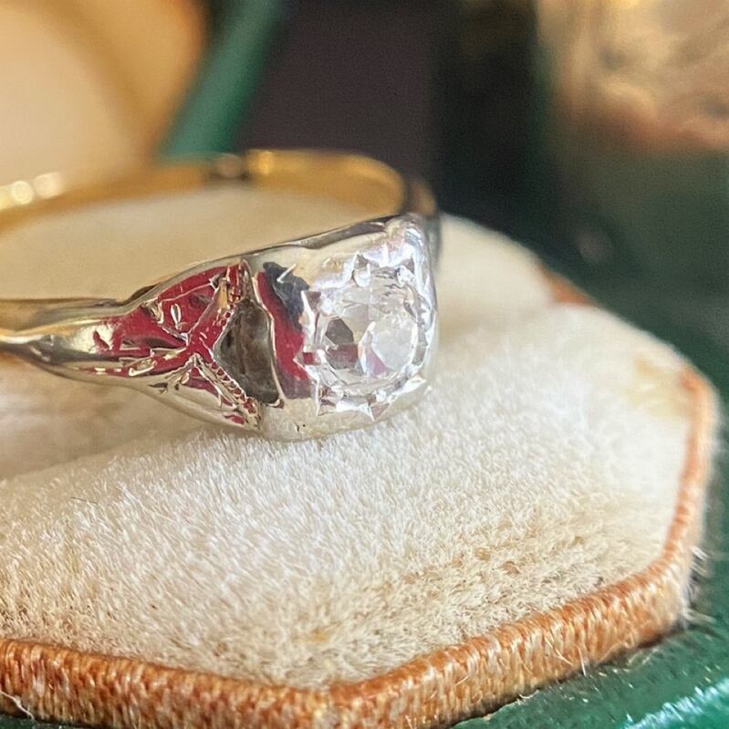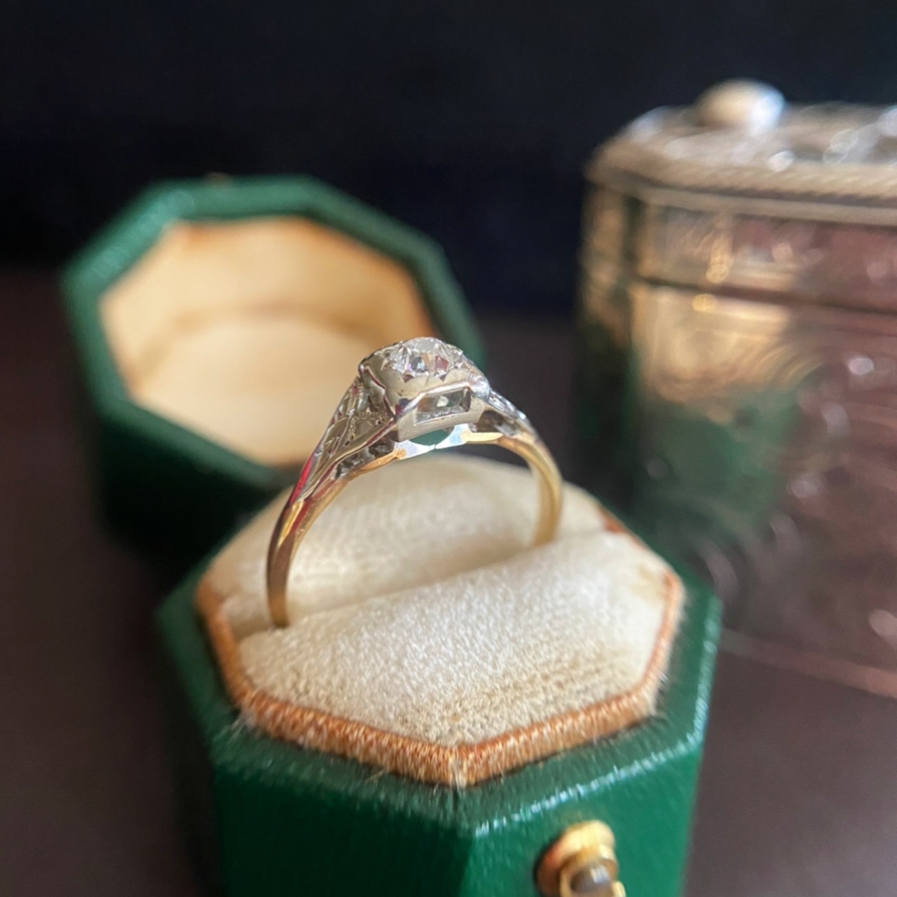 ダイヤモンドの周りはプラチナのフェイス&デザインでダイヤモンドを引き立て、イエローゴールドのシンプルなシャンクへと目線を繋いでいく、そんな美しい演出がアンティークリングには存在しているように感じます。