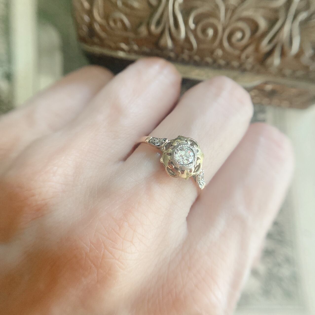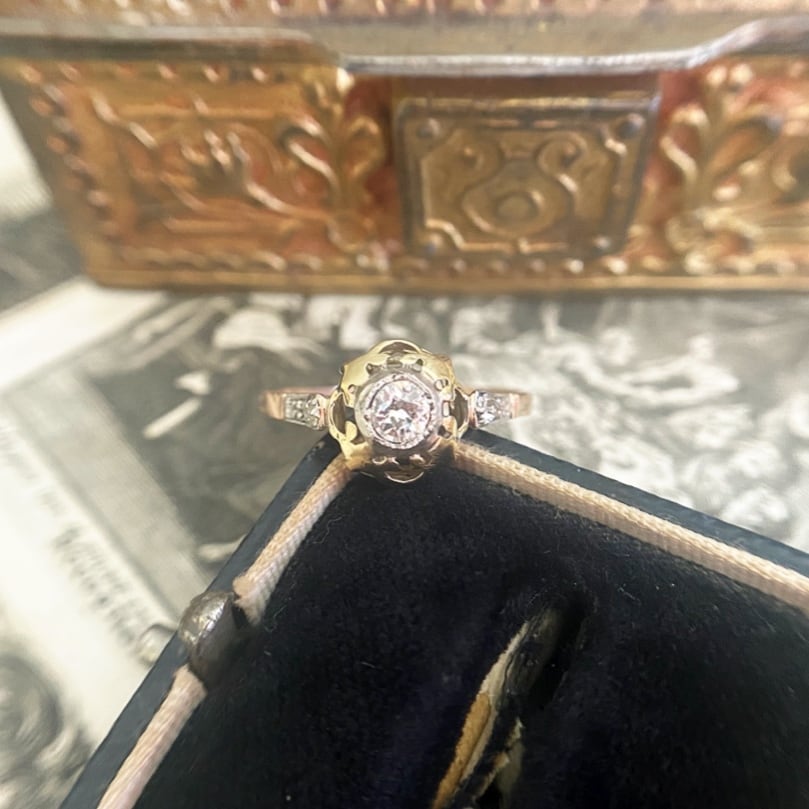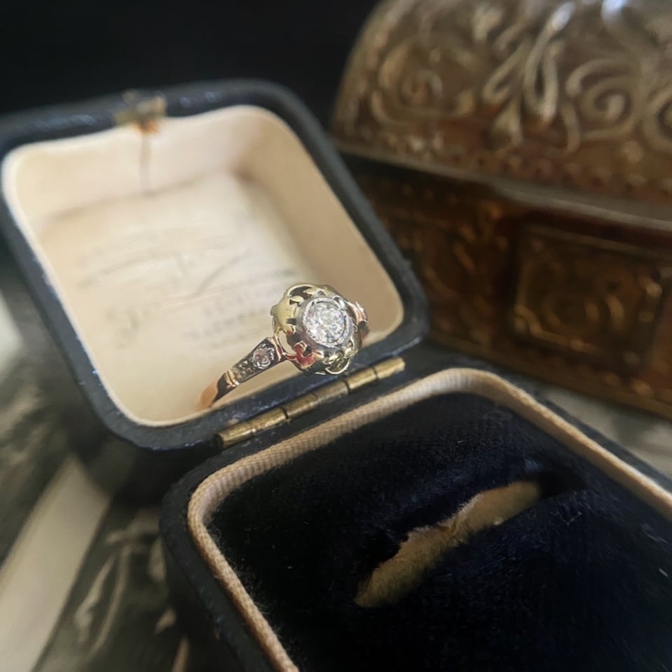 アカンサスの葉に囲まれるようにして佇むオールドヨーロピアンカットダイヤモンド、さりげないデコラティブ感が絶妙なヴィクトリアンリングのご紹介です。