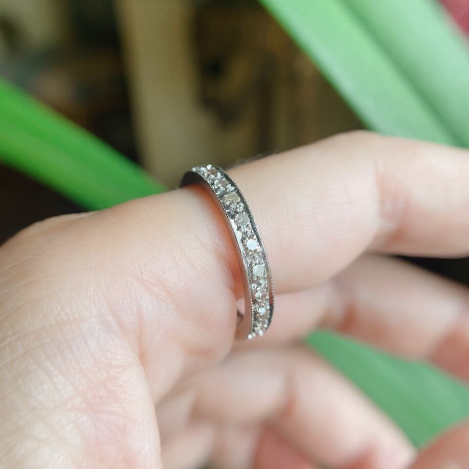 幅3ミリ程の細身のエタニティーで平均1.8mm程の綺麗なシングルカットダイヤモンドを留めています。ボーダーにはミルグレインがうたれ、光に反射してキラキラと煌めく姿にもうっとりとしてしまいます。