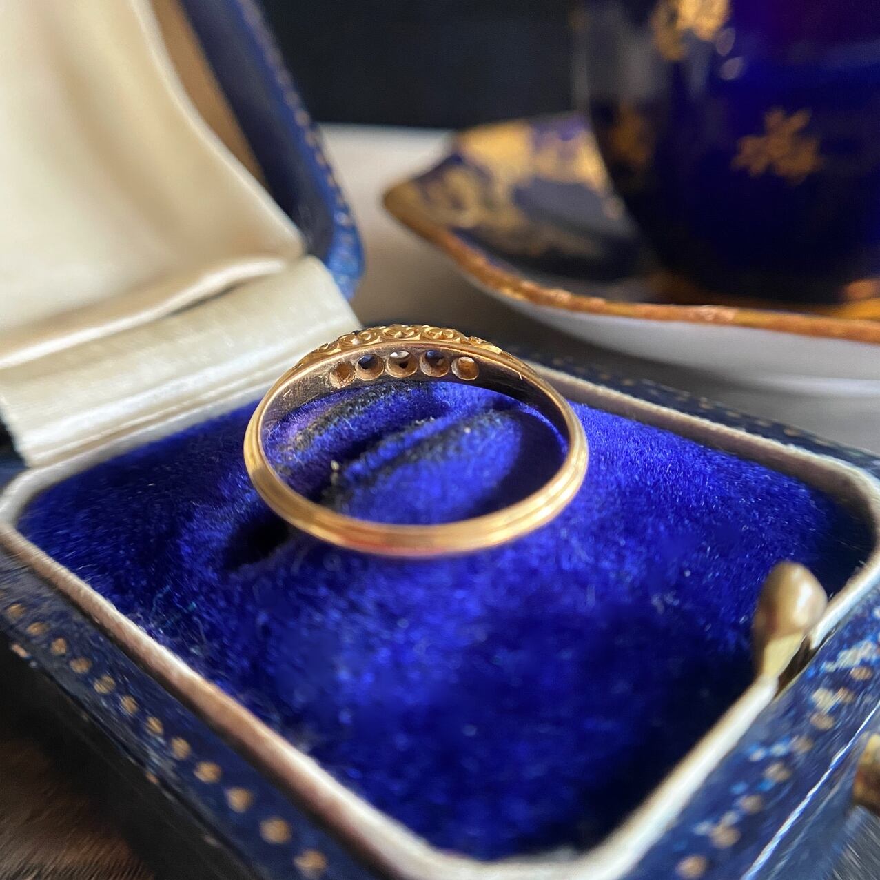 中央はオープンキュレットのオールドヨーロピアンカットダイヤモンド、両端はシングルカットダイヤモンドになっています。その合間のオーバルカットサファイアはサイズ感が少し違うのも、どこかノスタルジーで、今の規則正しいジュエリーにはない、和やかな気分を誘ってくれる、どこか柔らかみを感じさせる煌めきもアンティークジュエリーを身にまとう楽しみをあたえてくれるリングです。
