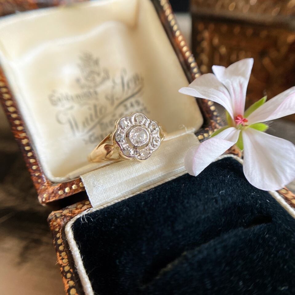 花のリングは今でも作られているデザインですが、ダイヤモンドのカットやセッティング一つでこんなにニュアンスが変わるのだから、アンティークってやっぱり素敵だな〜って改めて感じてしまいますね。