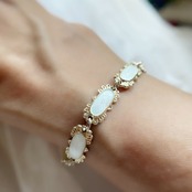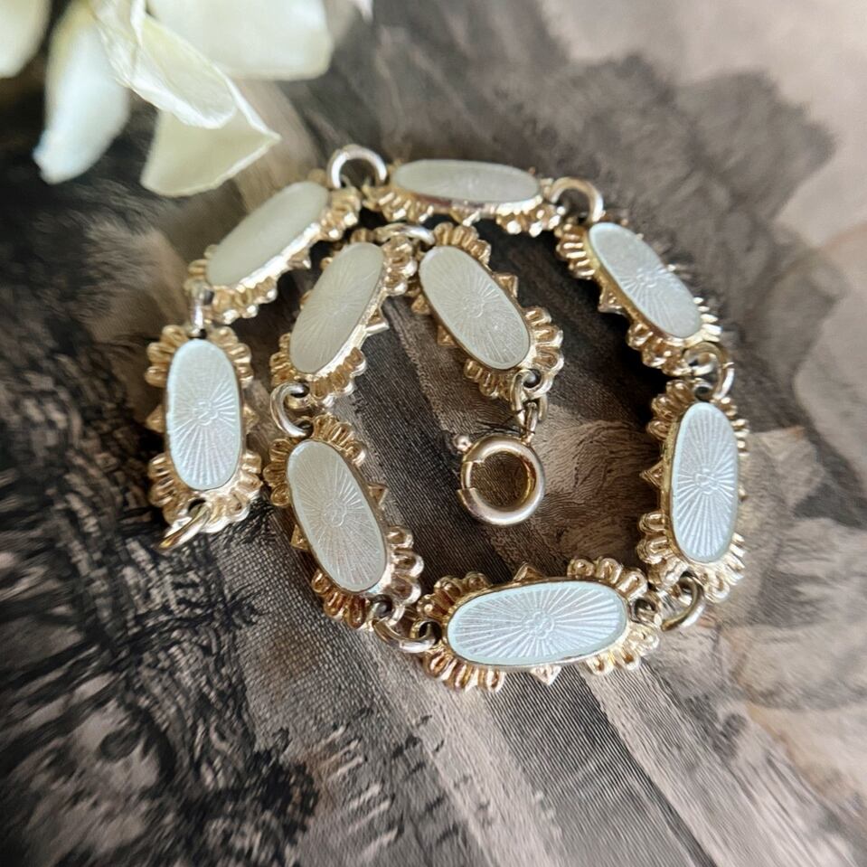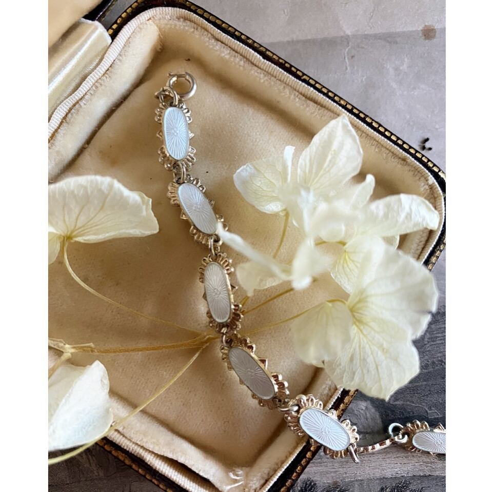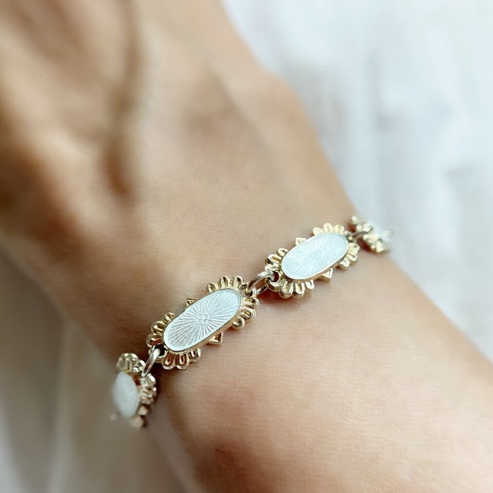 パールホワイトのような艶やかな質感が素敵なギロッシュエナメルのスターリングシルバーのスカンジナビアンブレスレットのご紹介です。