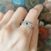 中心にはテーブルカットのサファイア、両サイドにはトライアングルカットサファイアを、その合間には星屑のように小さな小さなダイヤモンドをセットした、スタイリッシュでモダンなひと品です。