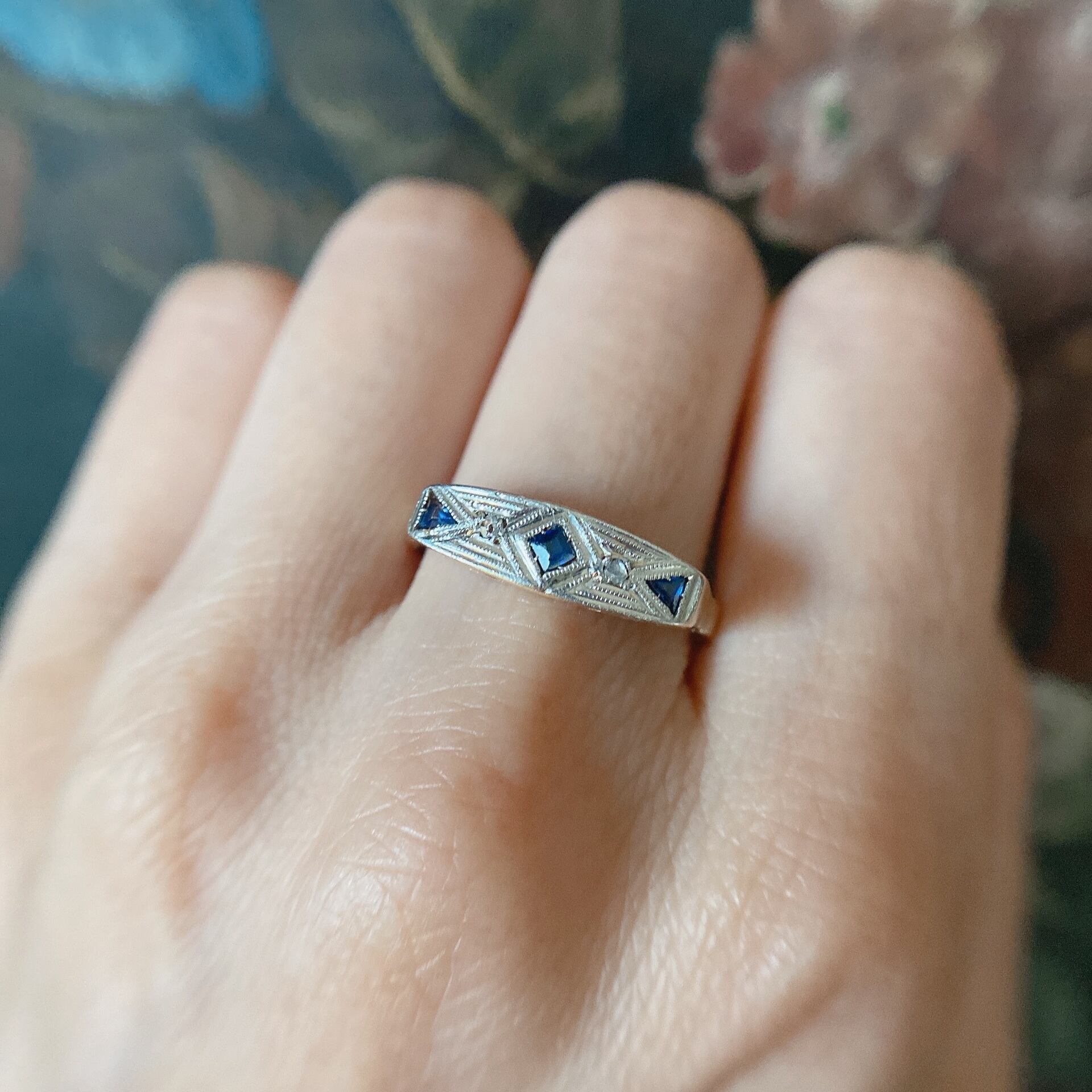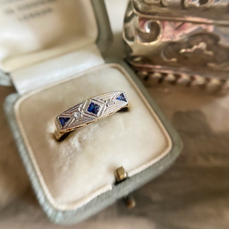 アールデコらしいすっきりとした印象はなんといってもサファイアのカッティングにあります。