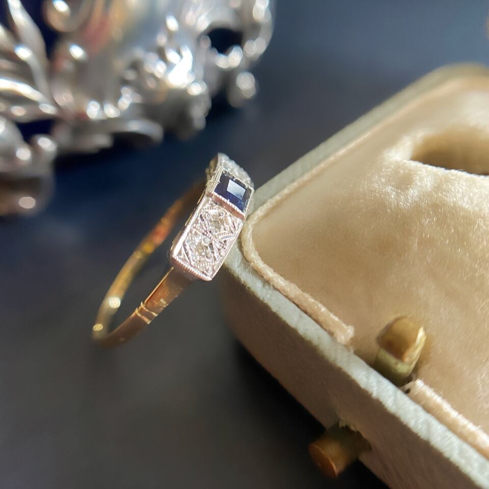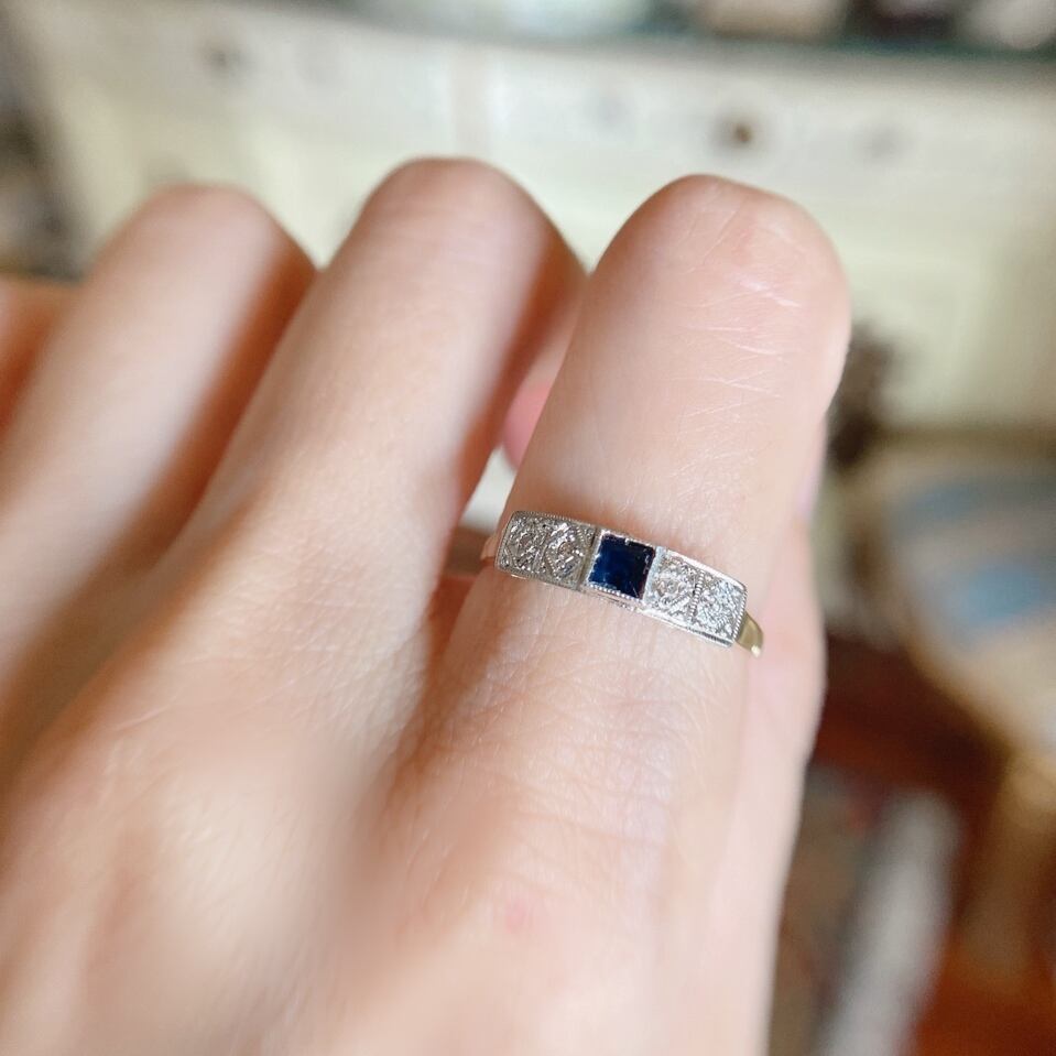 そこに直線で正方形にお部屋を作り、そのお部屋には更に菱形の枠を作り、そのそれぞれにキラキラと星屑のようなメレダイヤモンド、そして中央には面取りしたスクエアのサファイアをセットした、一見シンプルですが、実に手間のかかった美しいデザインのエドワーディアンからアールデコに向かって行って時代のリングになります。