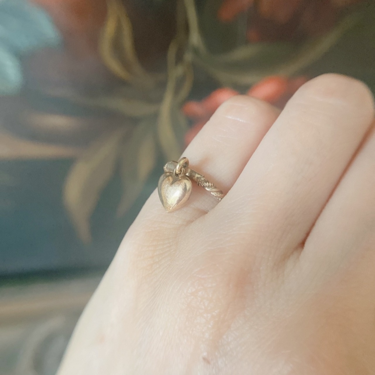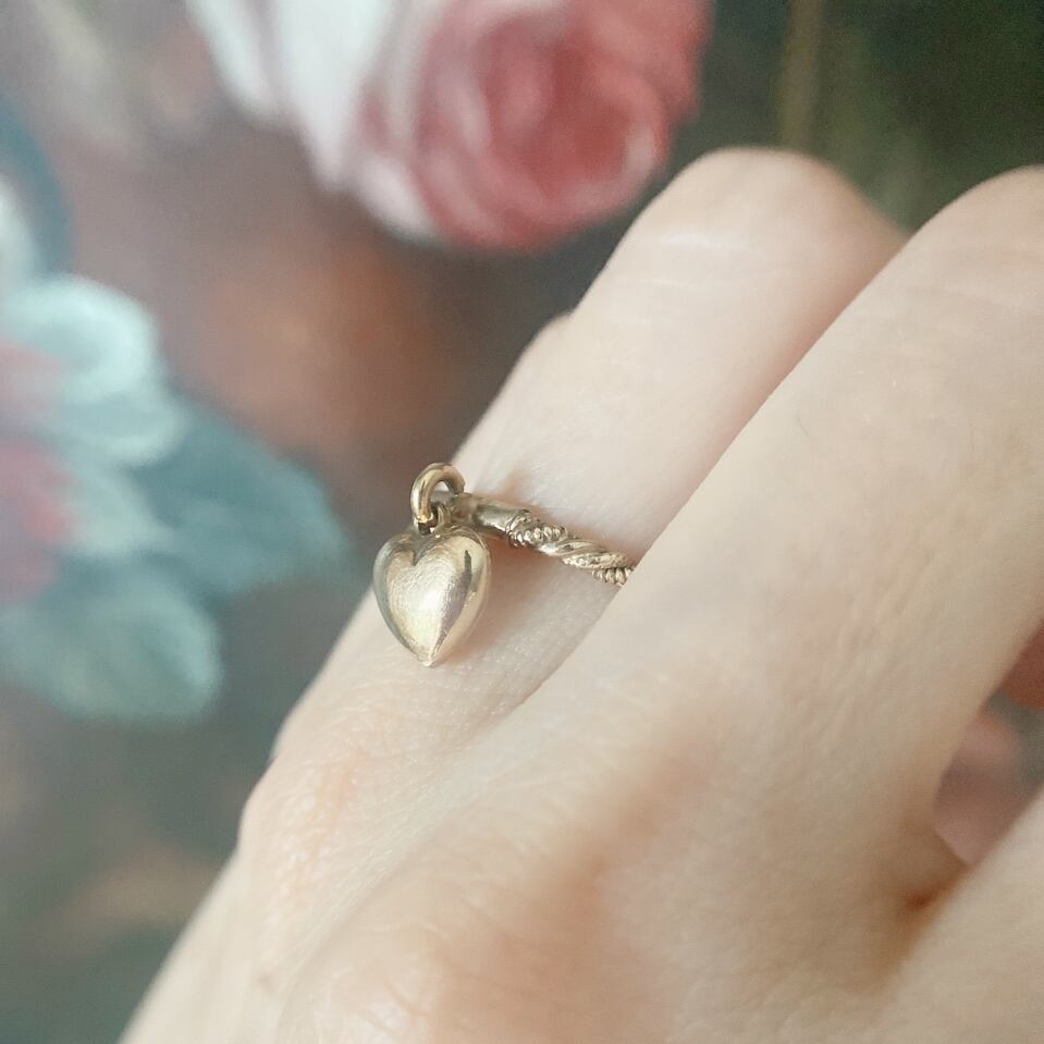 コロンとふっくらふくらんだハートのチャームが付いたハンギングハートヴィクトリアンリングのご紹介です。