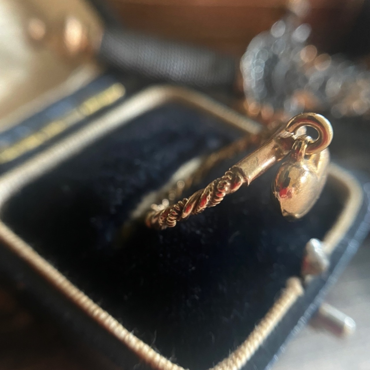 スムーズロープとツイストロープとドット模様のロープの3つのテクスチャーのゴールドが美しく絡み合い、それらが織りなす印影の美しさは決して鋳型で作られたリングでは味わう事の出来ないアンティークならではの独特の”美“が宿っています。