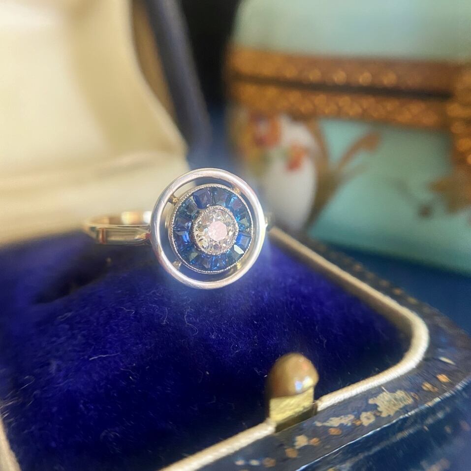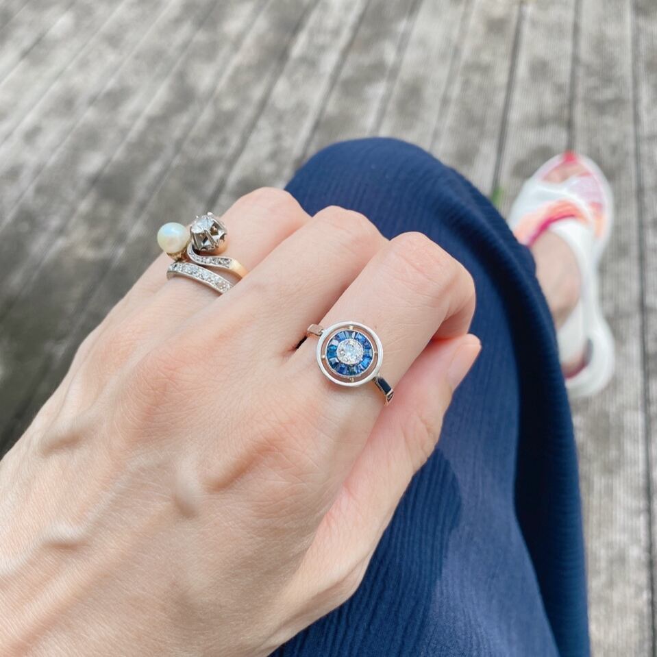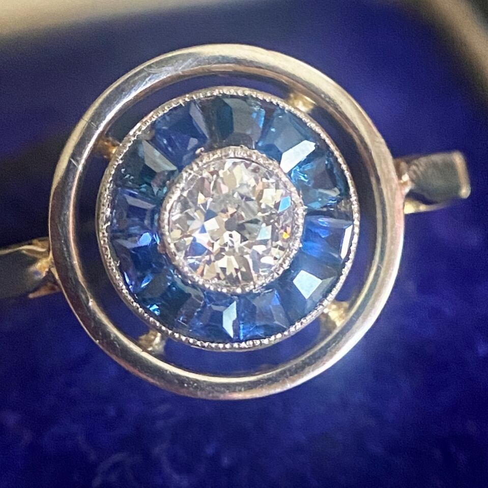まるで羅針盤を思わせるサークルデザインがモダンで、カリブレカットサファイアに守られるようにしてオールドヨーロピアンカットダイヤモンドが佇んでいるアール・デコリングのご紹介です。