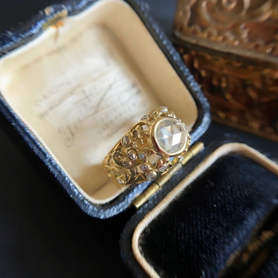 自然の美しさをお手本としたアール・ヌーヴォーの美しい曲線、朝露に輝く薔薇のように大粒のフルローズカットダイヤモンドがセットされた、大人の女性にぴったりのエレガントなリングのご紹介です。