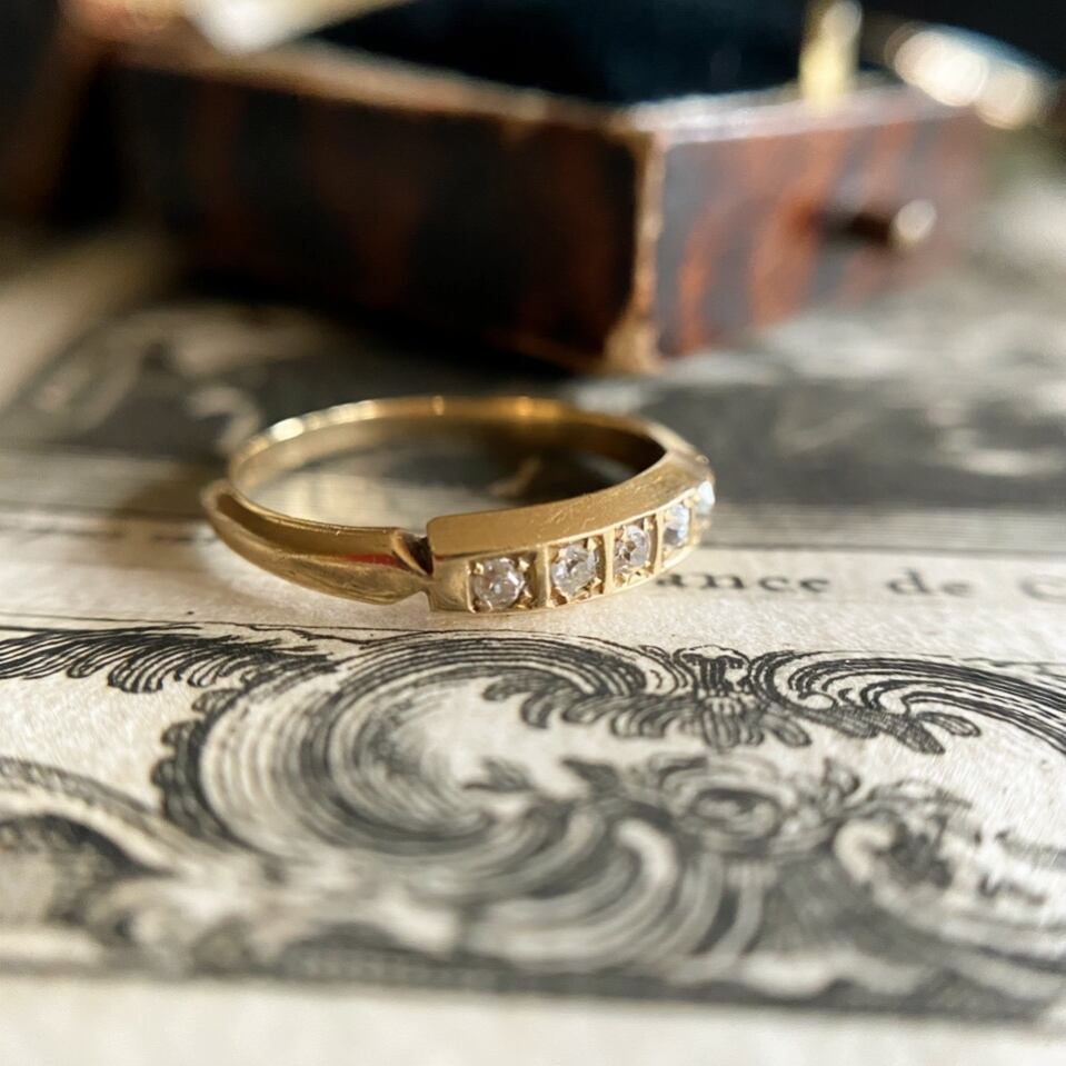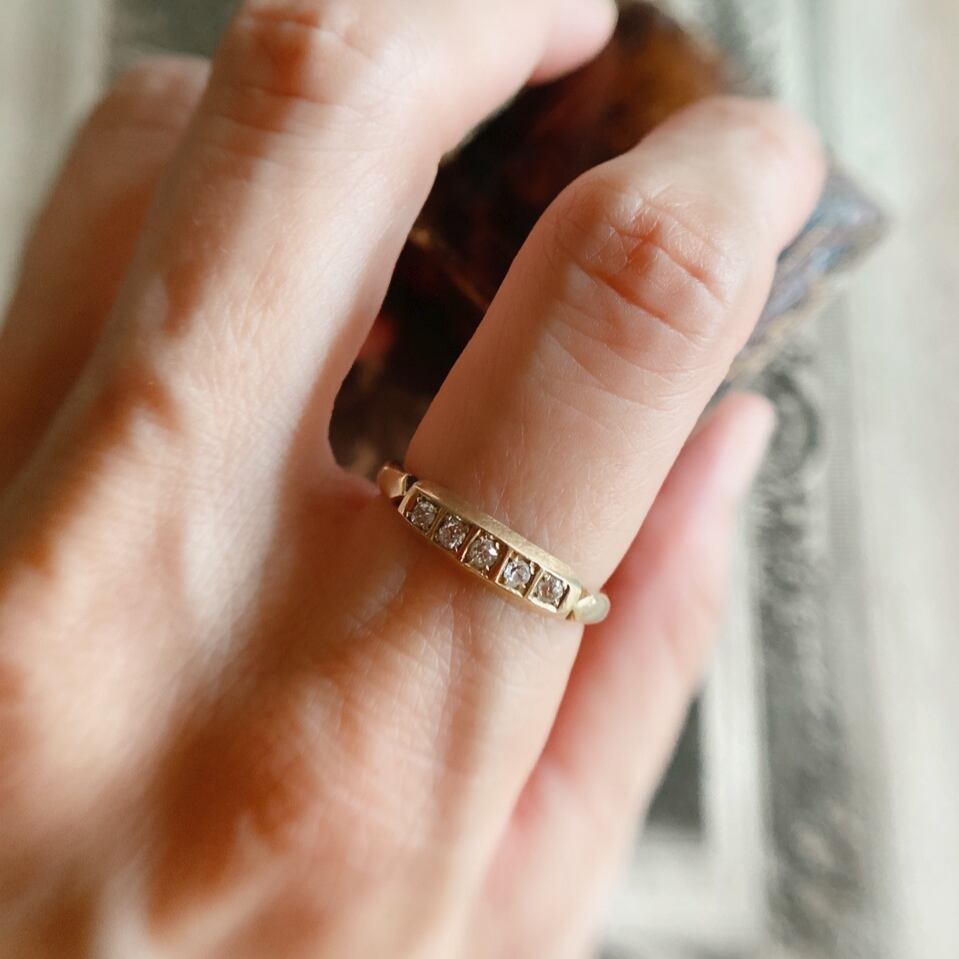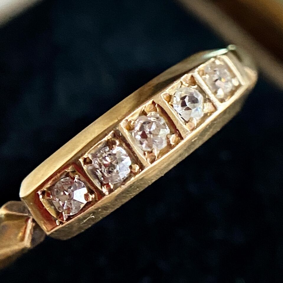 すっきりとシンプルな長方形のフェイスに正方形で小窓を作り、それぞれに瑞々しいオールドカットダイヤモンドをセットした、まるで星座のようなリングは全体的にとてもすっきりとした印象で、星屑のダイヤモンドとイエローゴールドのさり気ないコントラストの中で小さな輝きが愛らしく、一見何の変哲もない一文字リングですが、アンティークらしい落ち着き漂う雰囲気は格別ですね。