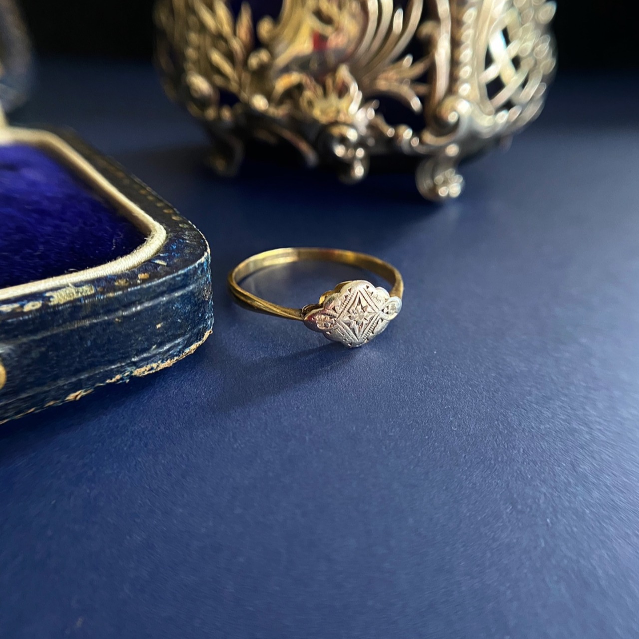 タガネにより力強く刻まれたアルハンブラ宮殿のアラベスク模様を思い起こす美しいデザインに目が止まる、アンティークらしいリングのご紹介です。