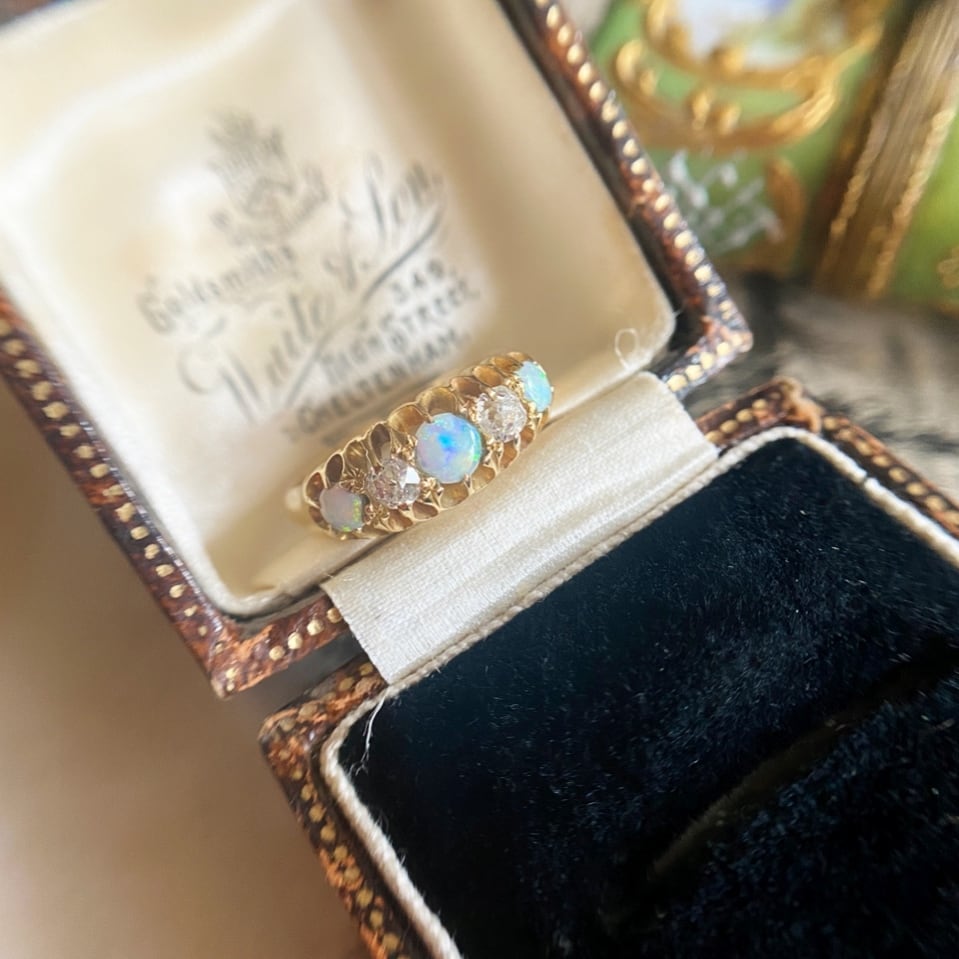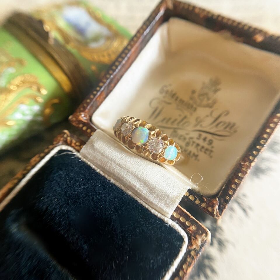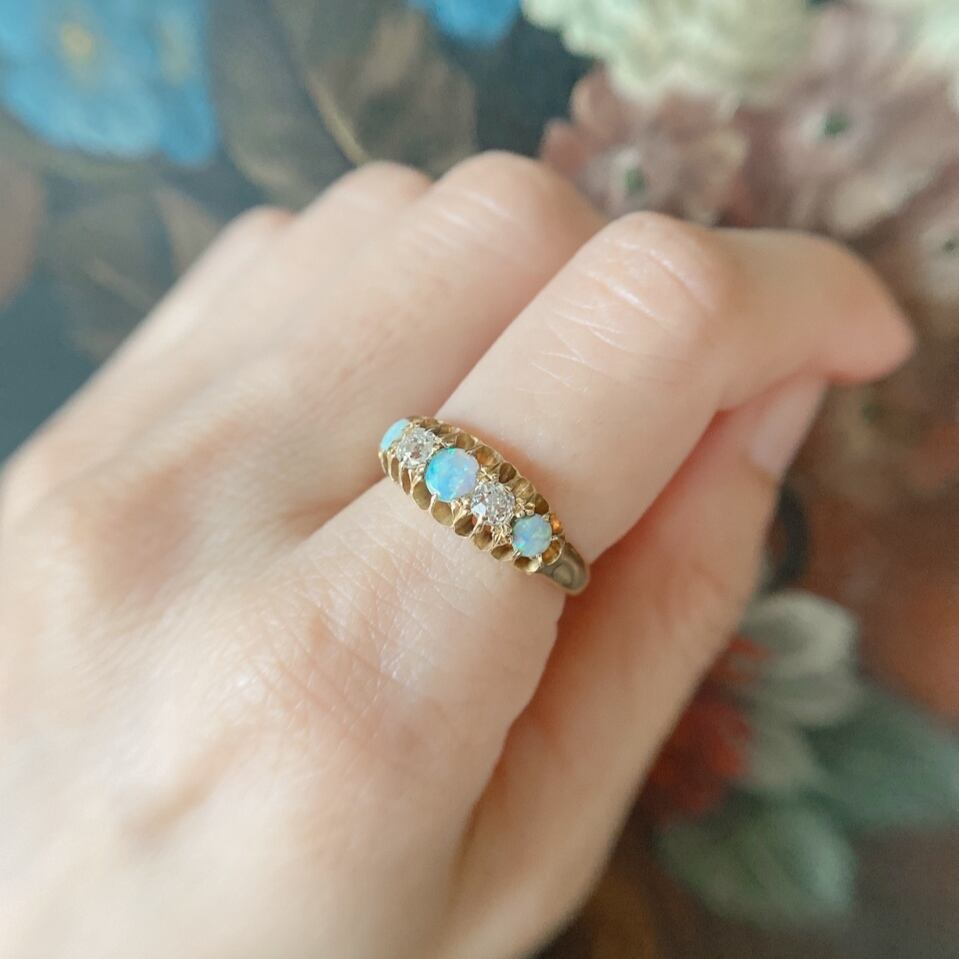 オーロラのように幻想的で様々な色をみせてくれる3石のオパール、そしてその間には2石のオールドマインカットダイヤモンドを添えて、ヴィクトリアンジュエリーの風格をたっぷりと感じる事ができるリングと言っても過言ではないでしょう。