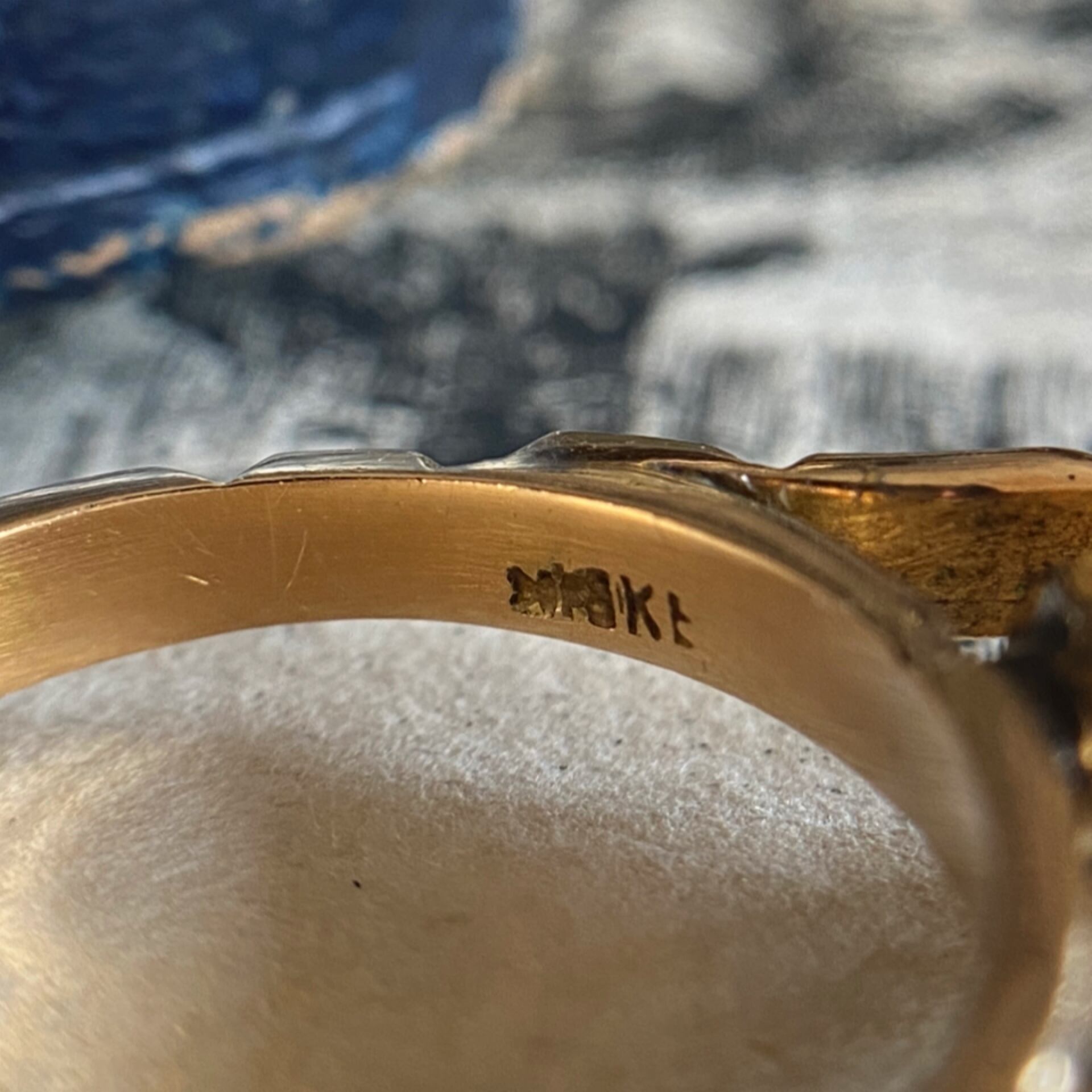 立体的でまるでオブジェのようなゴールドのシャンクに引き立てられるようにパールが持ち上げられたデザインは、当時からすればかなり斬新で前衛的なモダンアートのような感じだった事でしょう。