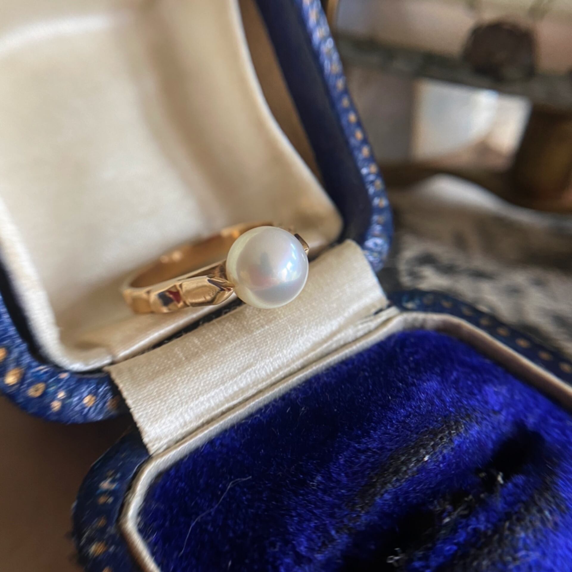 とっても斬新でモダンなエスプリを感じるデザイン、そしてシルキーなテリが美しい、一粒パールのリングのご紹介です。