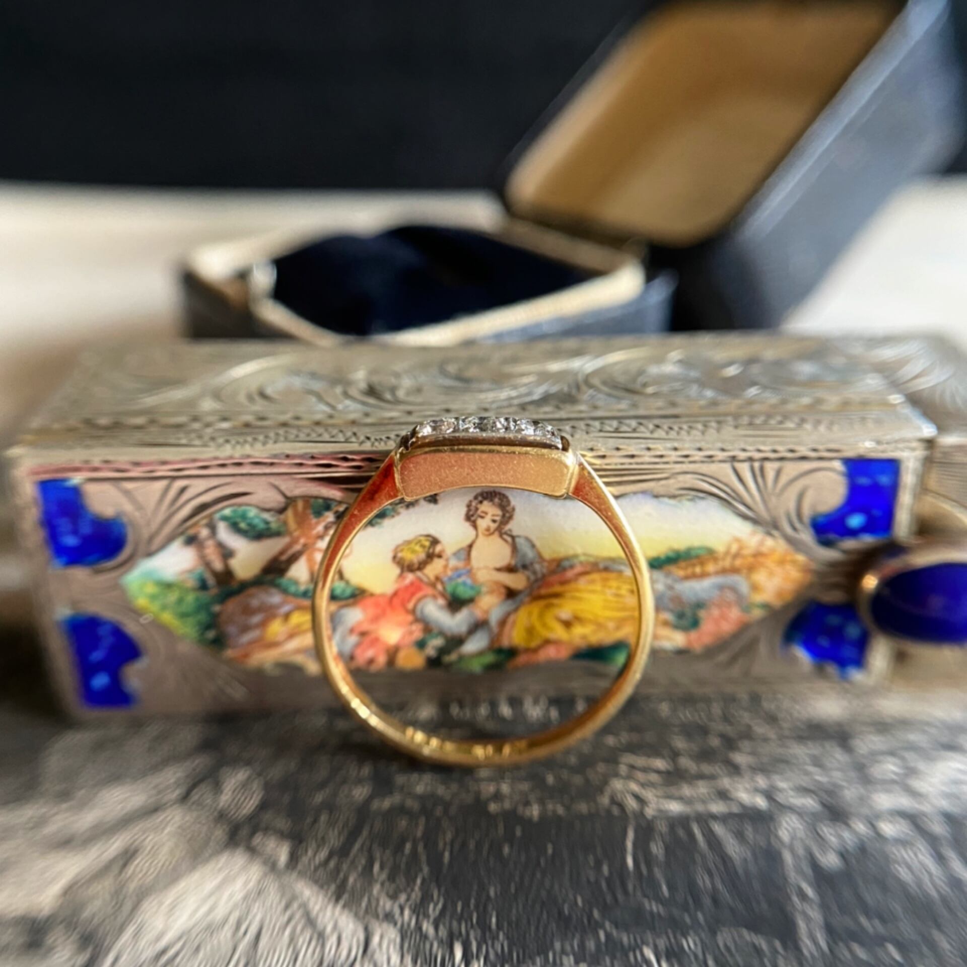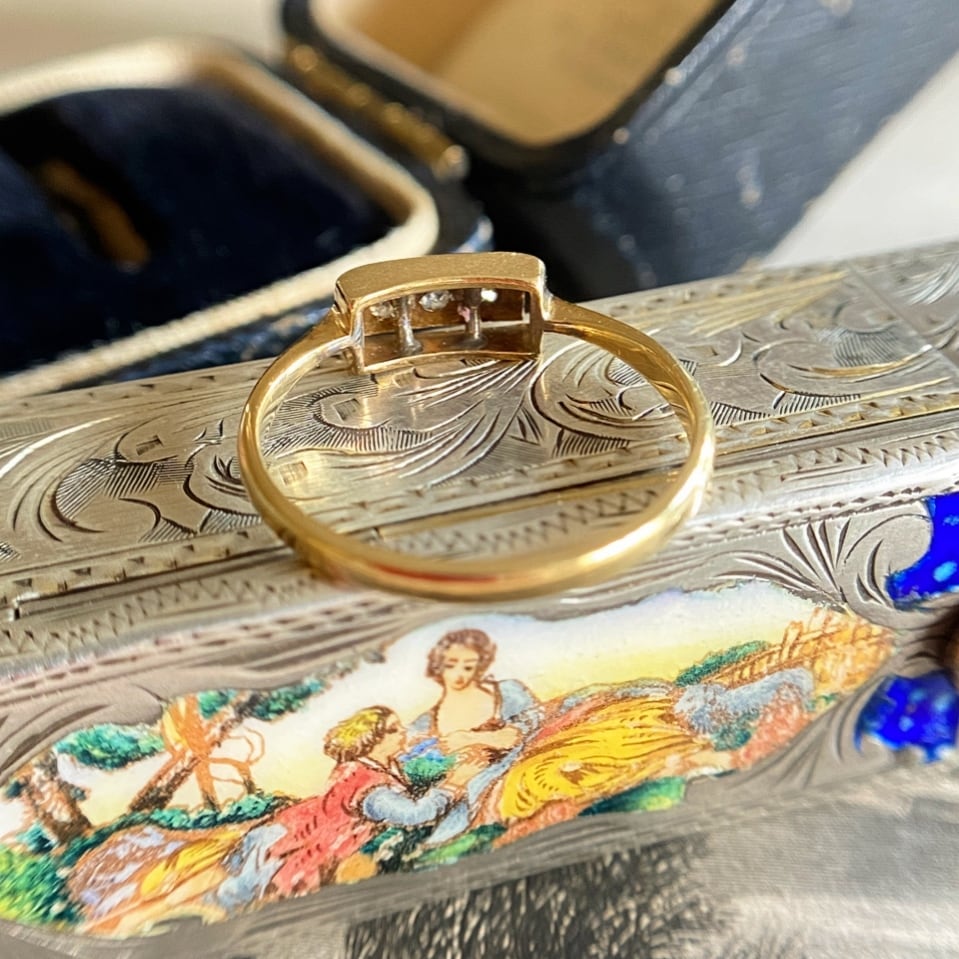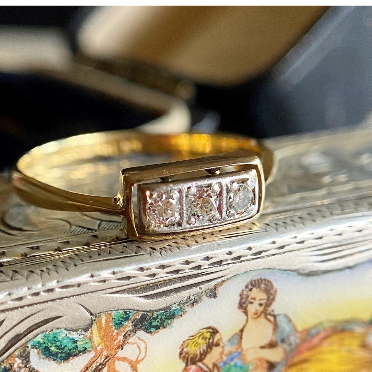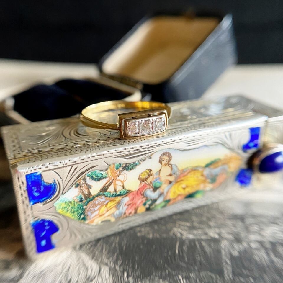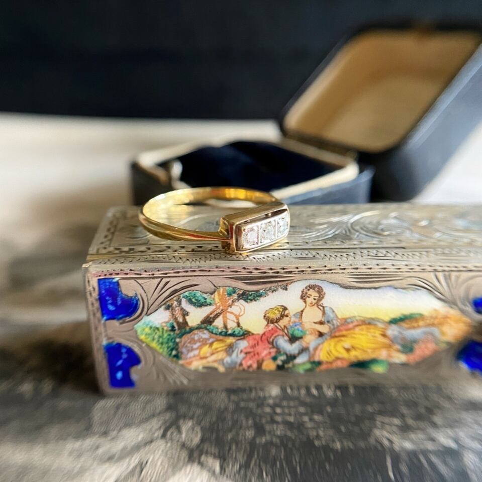 キリッと引き締まった輝きが魅力的なスリーストーンリングは1つはシングルカットダイヤモンド、2つはメレダイヤモンドがセットされており、もしかしたら後世になくなってしまった一つを前のオーナー様が新たに入れたのでしょう、大切にされてきた事を感じますね。