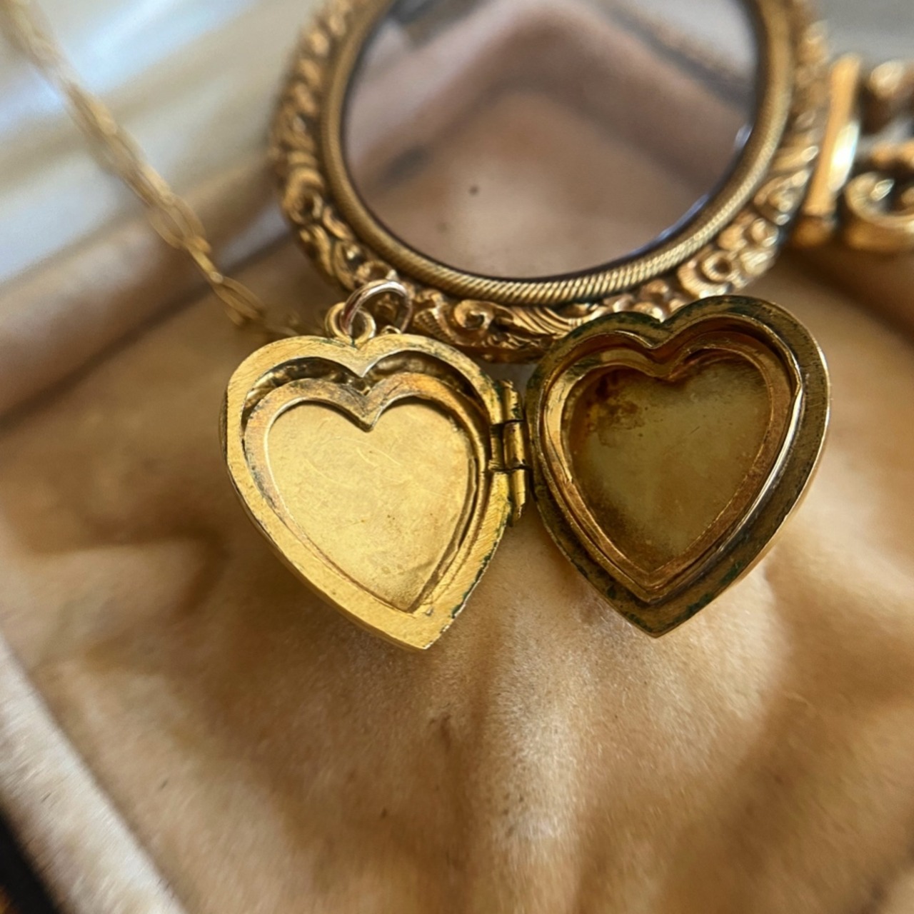 ゴールドに輝く小さなハートを開くと一回り小さなハートの枠、そこにあなただけの秘密の想いをそっとしのばせて、甘くセンチメンタルなモチーフを胸元に飾り、大切な誰かをいつも身近に感じることが出来る、素敵なひと品です。