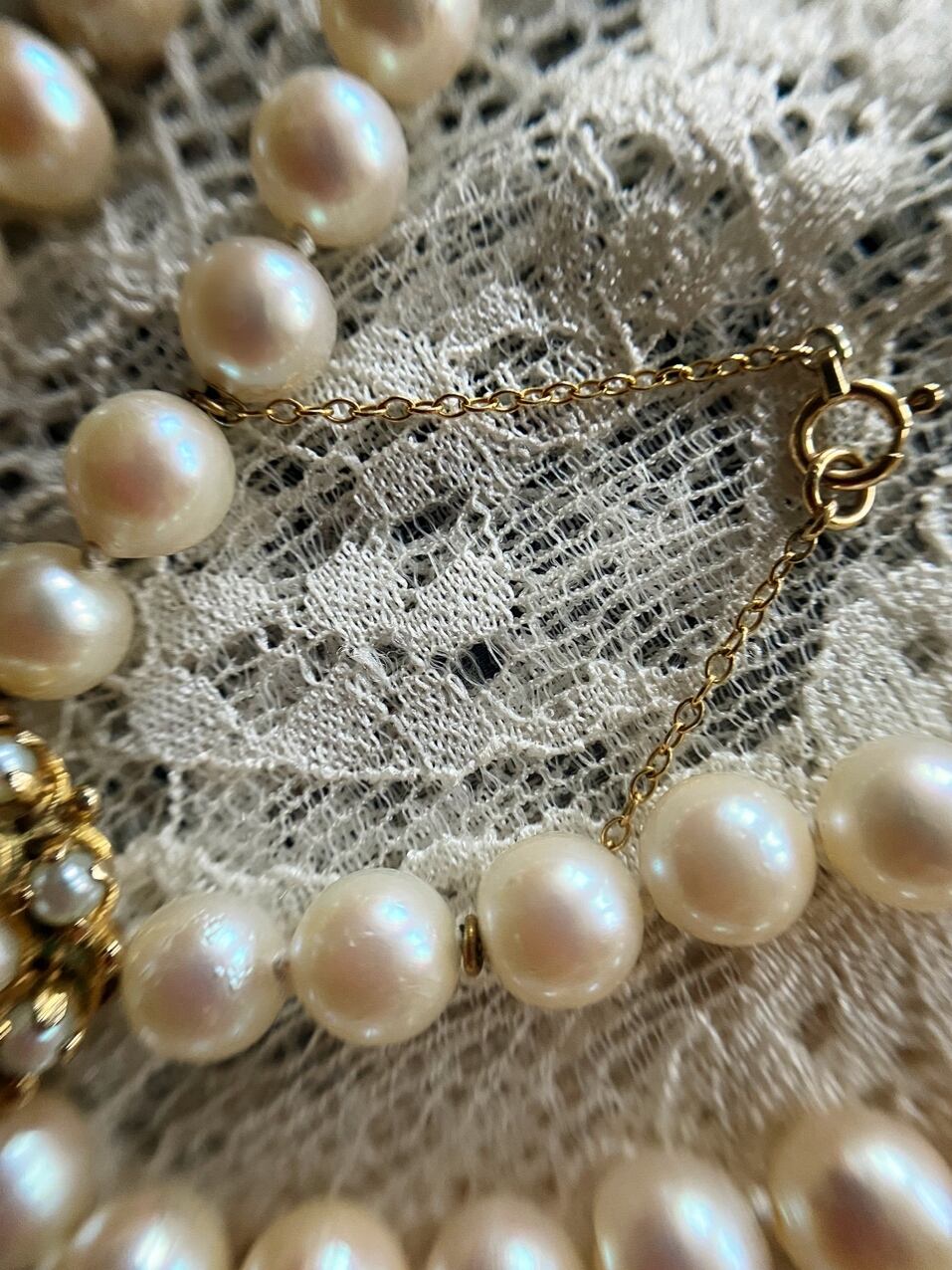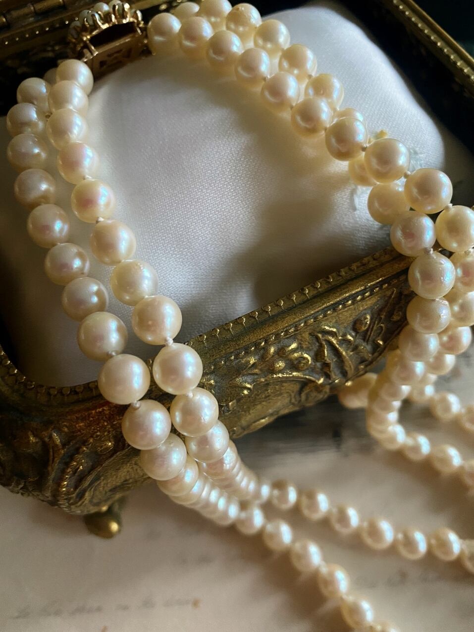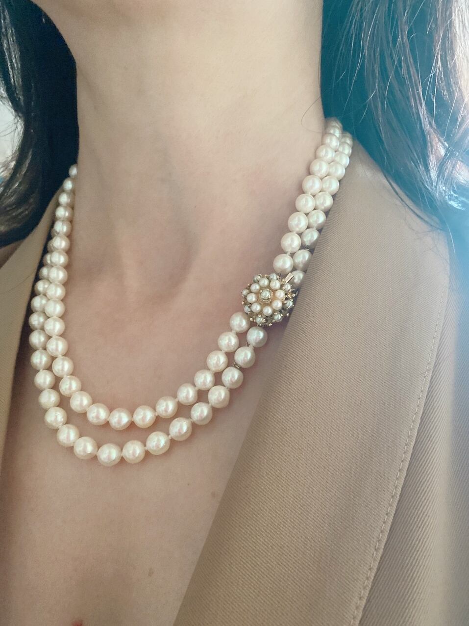 今でもこうした2連パールネックレスは販売されておりますが、取ってつけたような純白がとってもよそよそしく感じてしまうのは私だけでしょうか、、、。