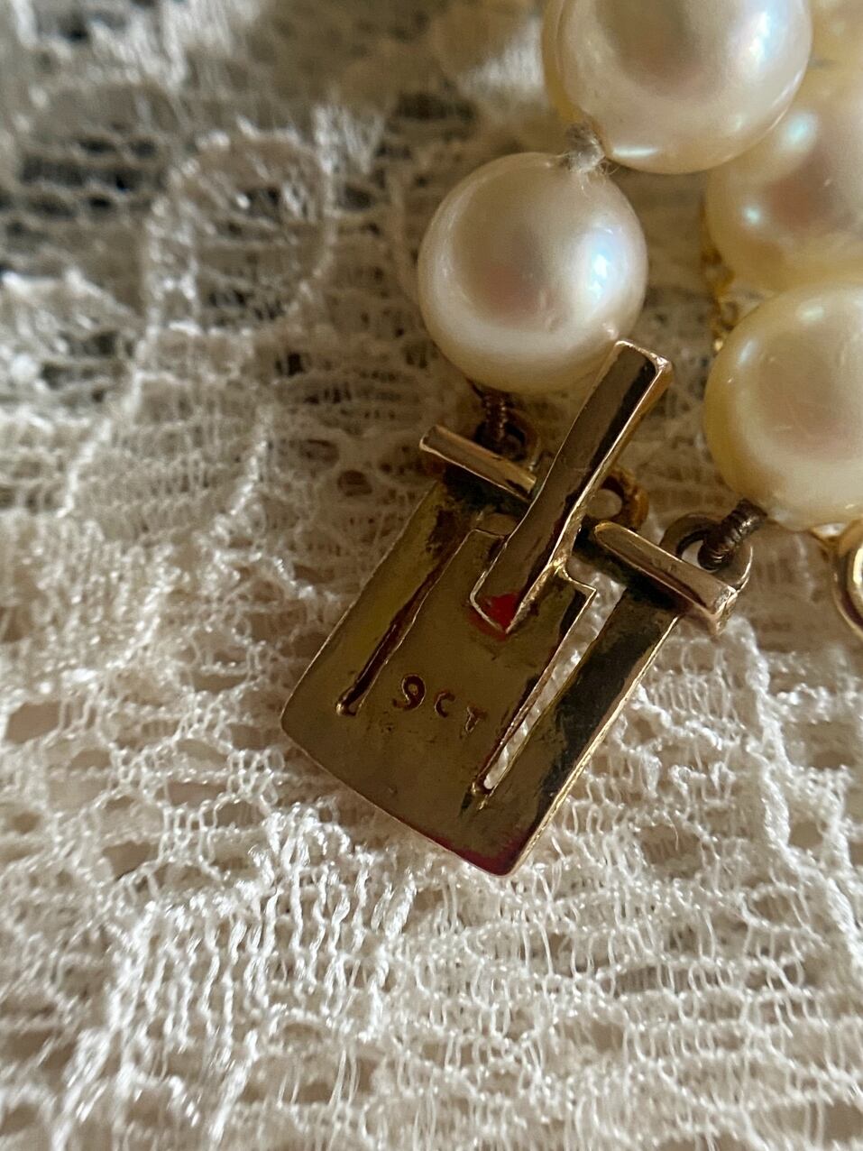 真珠はオールノットと言って昔の真珠のネックレスでよく見られるやり方で、糸を使って真珠を通し、珠と珠の間に結び目を作り仕上げられていて、万が一糸が切れたときに真珠の珠がなくなるのを防ぐことができ、また真珠の珠と珠があたらず傷みが少なくなるのが利点です。とても丁寧で綺麗なノットが入っている事がわかりますね。