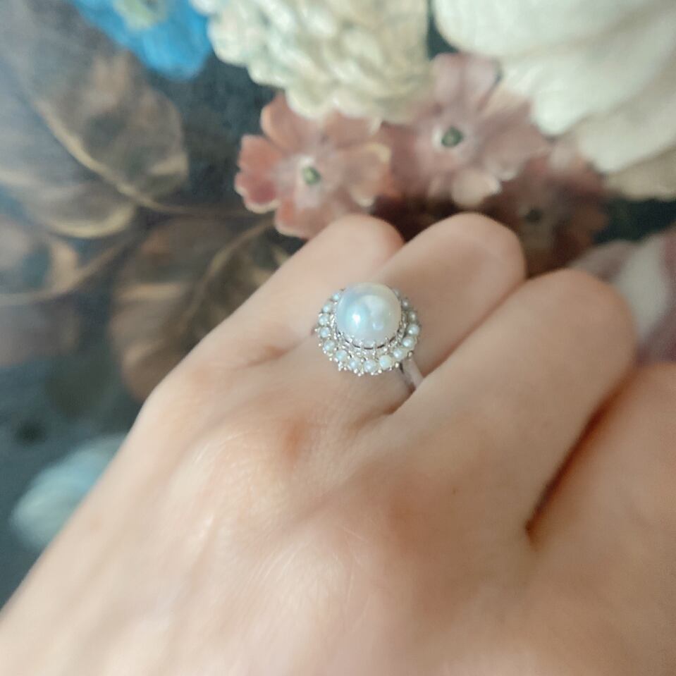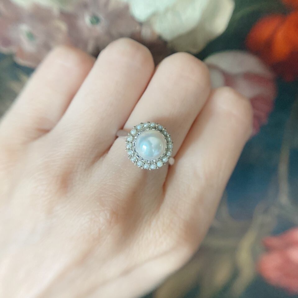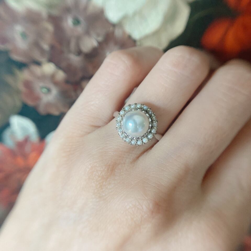 14kホワイトゴールドの地金に溶け込むように純白の艶々の美しい真珠がセットされ、取り巻きには小さなパールでクラスターをえがいた、とびきり魅力的なリングです。