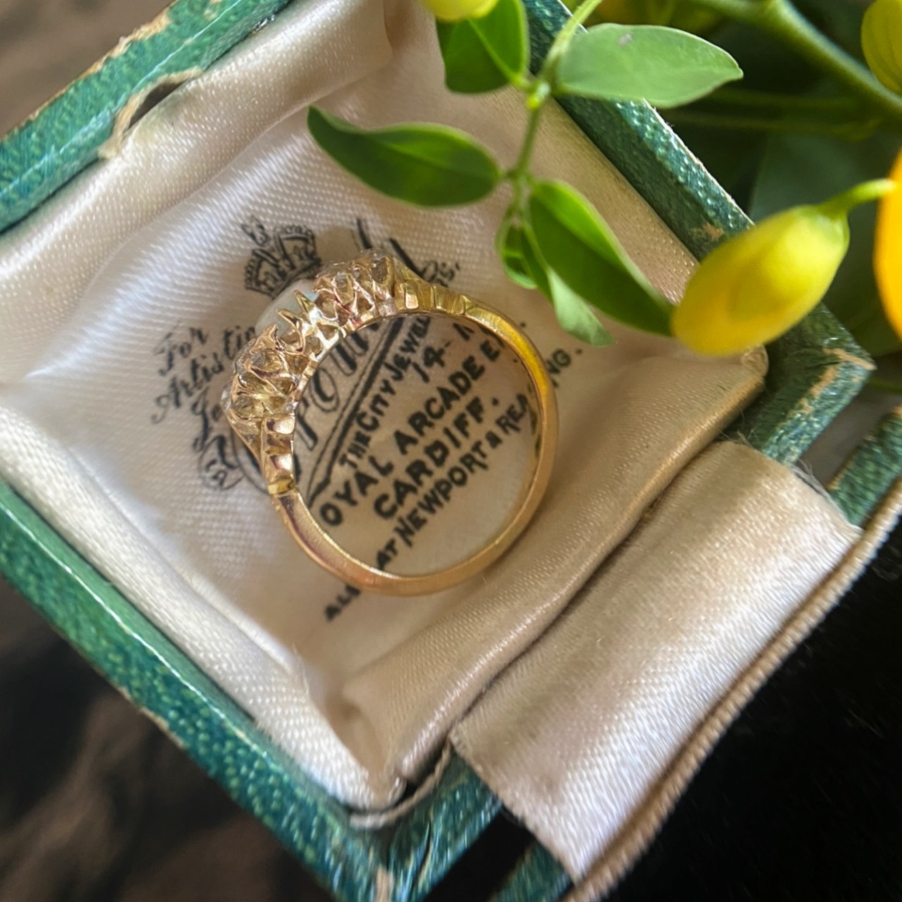 ショルダー部分にはそれぞれ3石づつ厚みのあるコロンコロンとしたオールドマインカットダイヤモンドがセットされており、シャムロックを表現しているのでしょう。朝露で煌めく小さなシャムロックのごとく、どれも瑞々しい輝きを放ち、脇役とは思えないその透明感と揺れ動く浮遊色を見ながら思わず手をチラチラと動かしてしまいます。