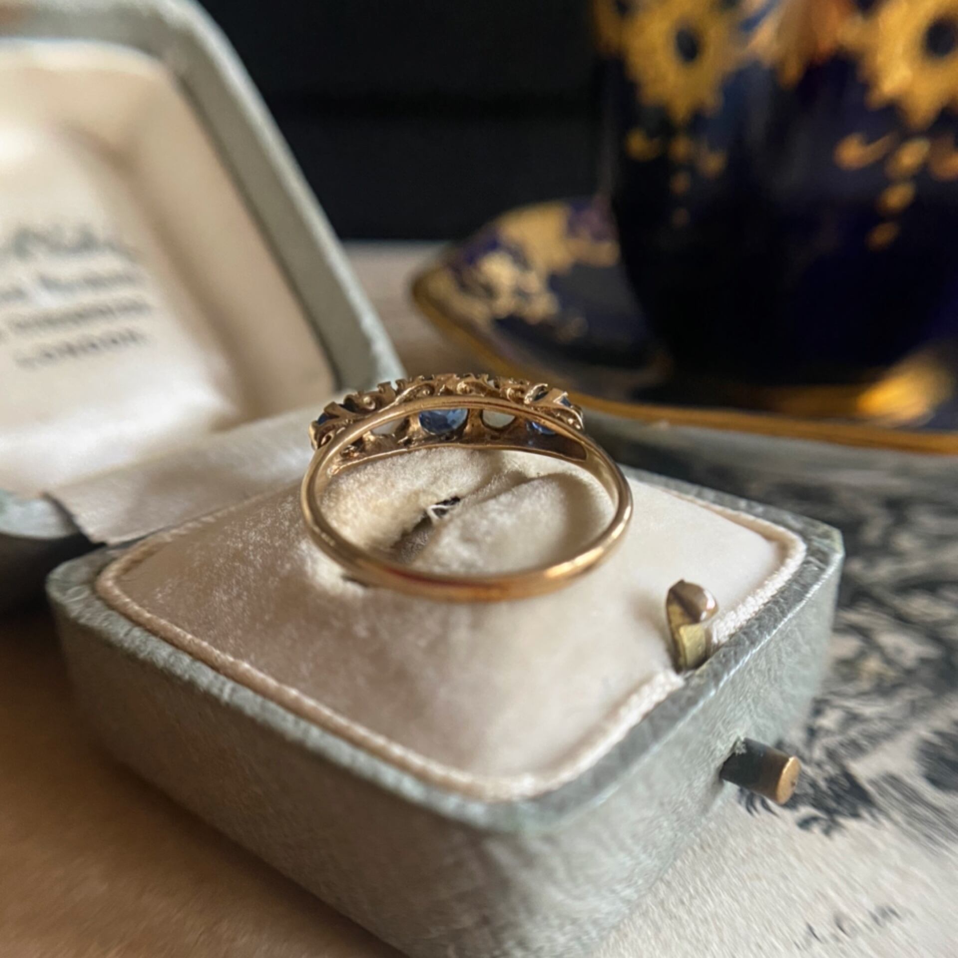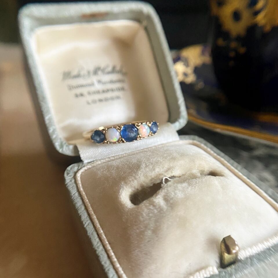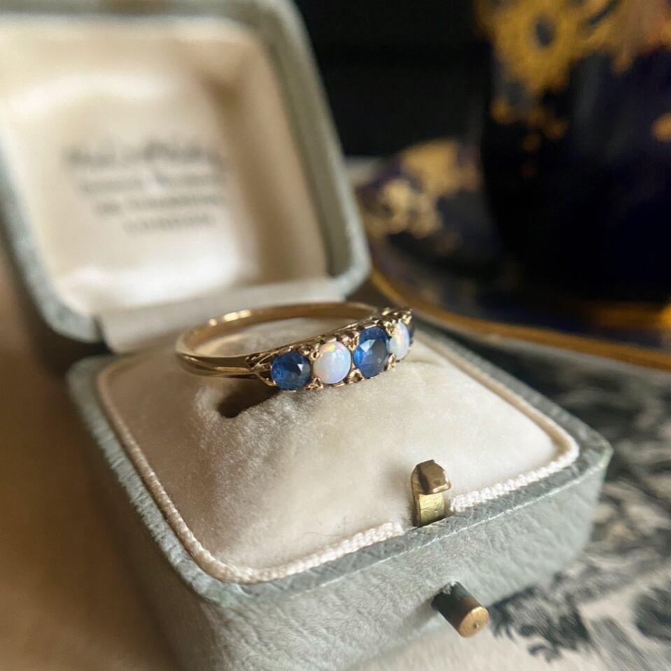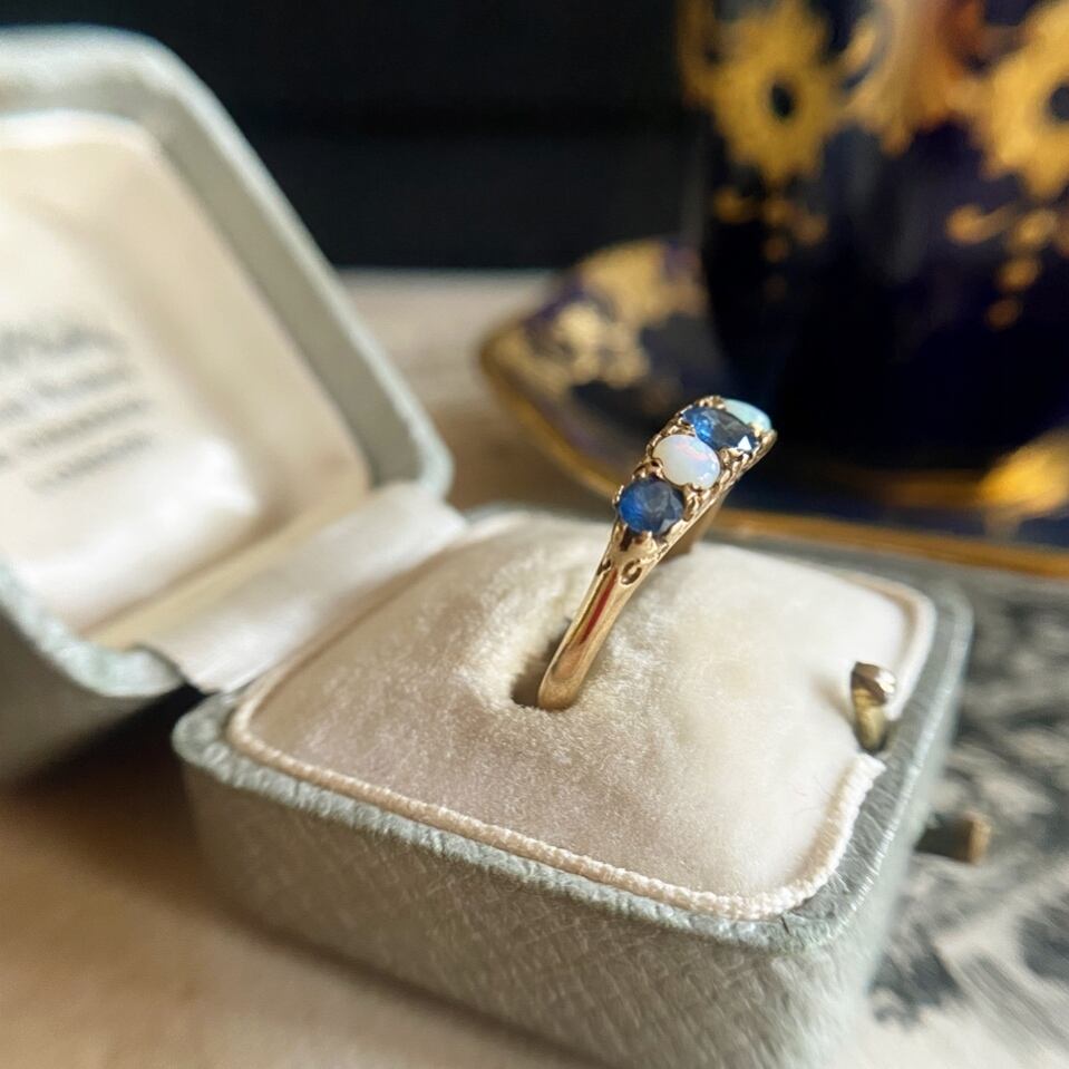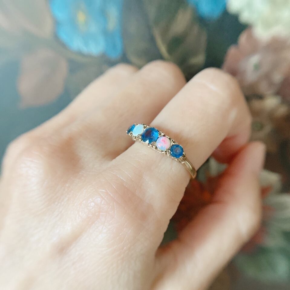 3石の爽やかな発色のブルーサファイアと2石のオパールの相乗効果で、リングにより華やかさを与え、瑞々しい輝きのサファイアと妖艶な輝きのオパールが、ゴールドのシャンクに引き立てられ、それぞれの輝きが引きしまりながら調和を保っている姿には落ち着きさえも感じる、大人な仕上がりのアンティークらしい美しいひと品です。なかなか見かけない組み合わせなのも嬉しいですね。