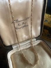 特に目立つ変色もなく、味わい深い色味の9金ゴールドチェーンは、今現代の煌びやかな金色に見慣れているとちょっと物足りなく感じる方もおられるかもしれませんが、アンティーク好きならばこの落ち着きある輝きの品の良さをわかって頂けると信じております。
