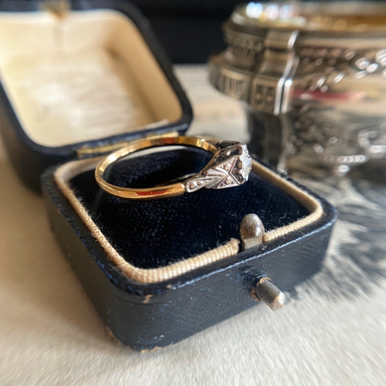 時の経過を経たゴールドのシャンクはどこかあたたかみがあり、当時流行したプラチナフェイスのクラシカルなスタイルのリングと共に過ごす時間の喜びを実感して頂けるひと品です。