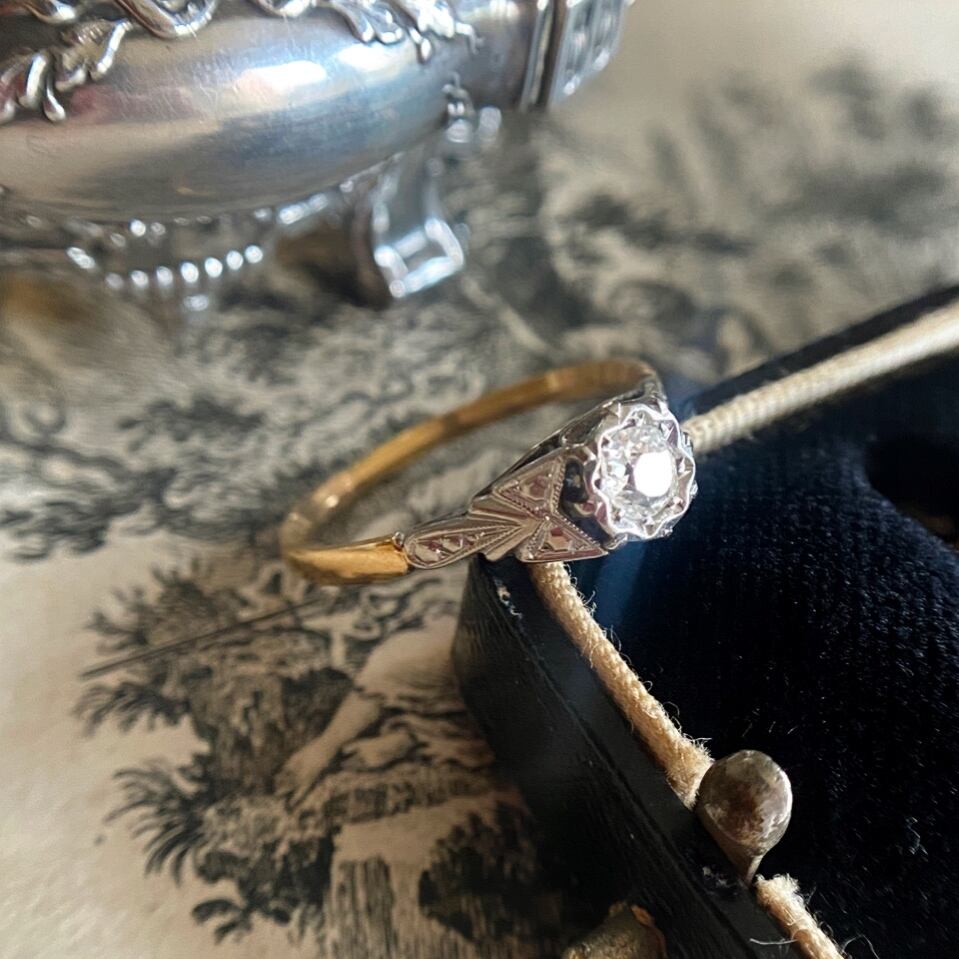 ダイヤモンドがセットされたフェイスをよく見るとフラワー型になっていて、そこには今のダイヤモンドには決して望む事が出来ないゴツゴツとした厚みのあるオールドカットダイヤモンドがノスタルジックな空気感を漂わせセットされています。ダイヤモンドはテーブル面が小さく、オープンキュレット特有のまん丸おめめが見え、直径約4.3mm程の透明感のある瑞々しいオールドヨーロピアンカットダイヤモンドは清涼感があり、プラチナの白い輝きを一緒に纏いながら煌めく姿は優美に感じますね。