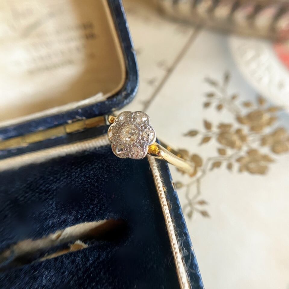 アンティークジュエリーの中でも愛くるしいデザインである、デイジー(雛菊)を象った小さなリング。