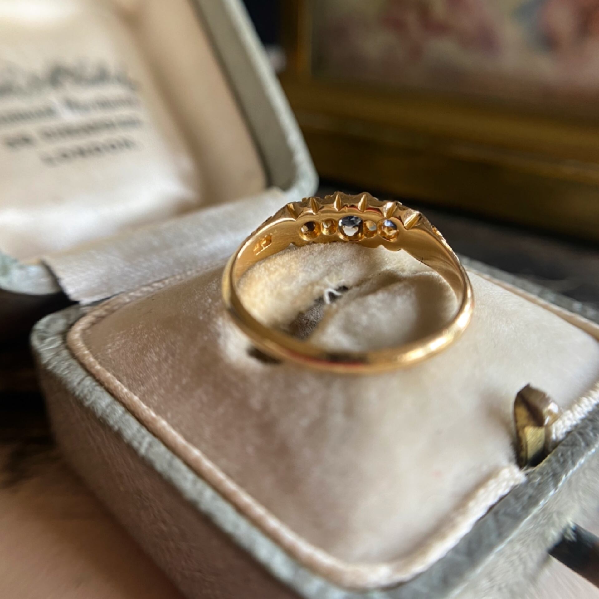 可憐なエドワーディアンらしい優美な雰囲気をたっぷりと漂わせているサファイアとダイヤモンドのファイブストーンリングのご紹介です。