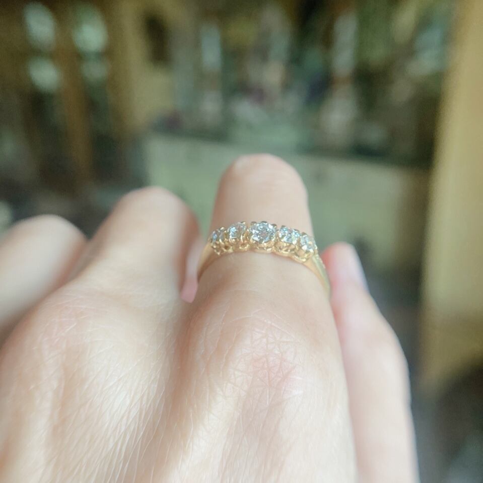 装飾の一切ないシンプルなイエローゴールドのシャンクだけど、ショルダー部分はペタッと潰したようなデザインがアンティークの風格を漂わせる普段使いに程よいファイブストーンリングのご紹介です。
