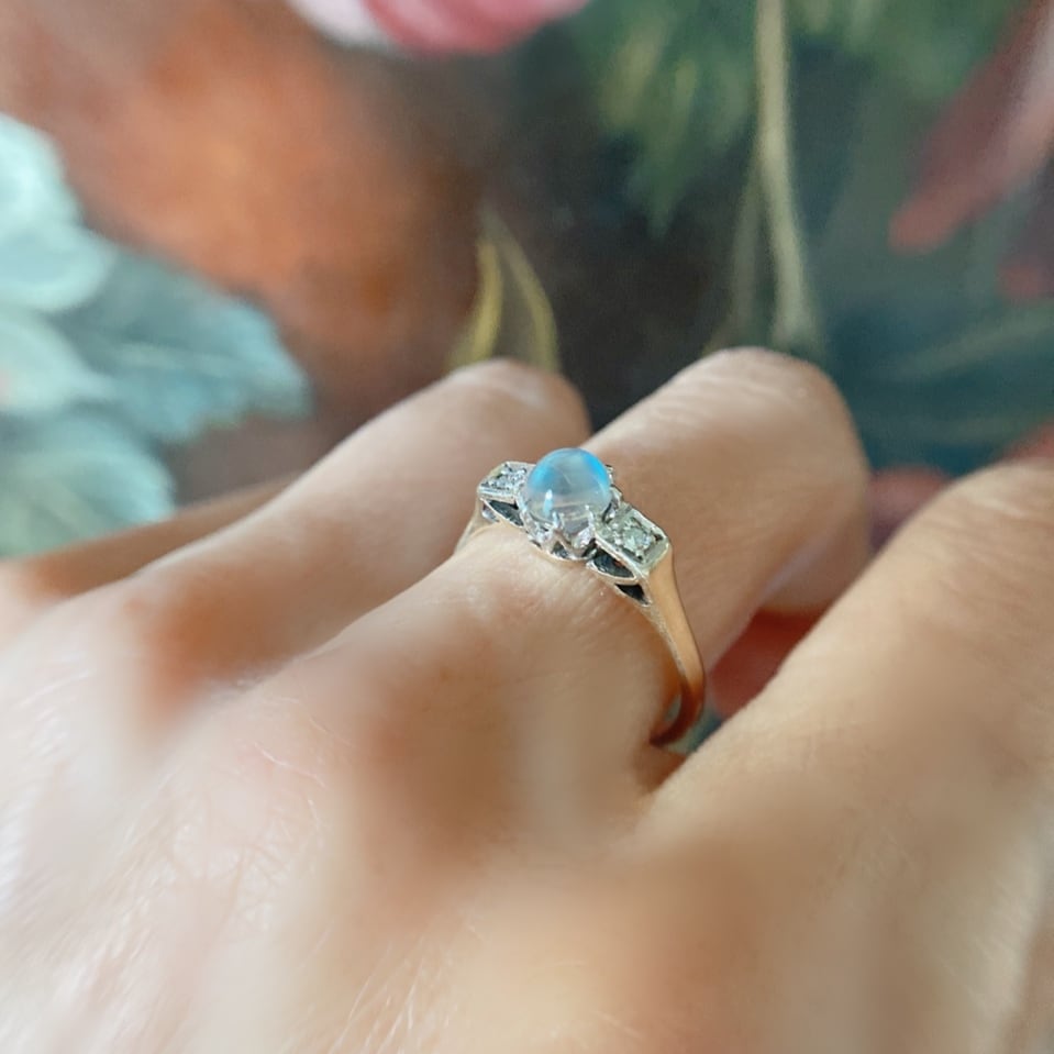 カボションカットブルームーンストーン&ダイヤモンドアンティークリング