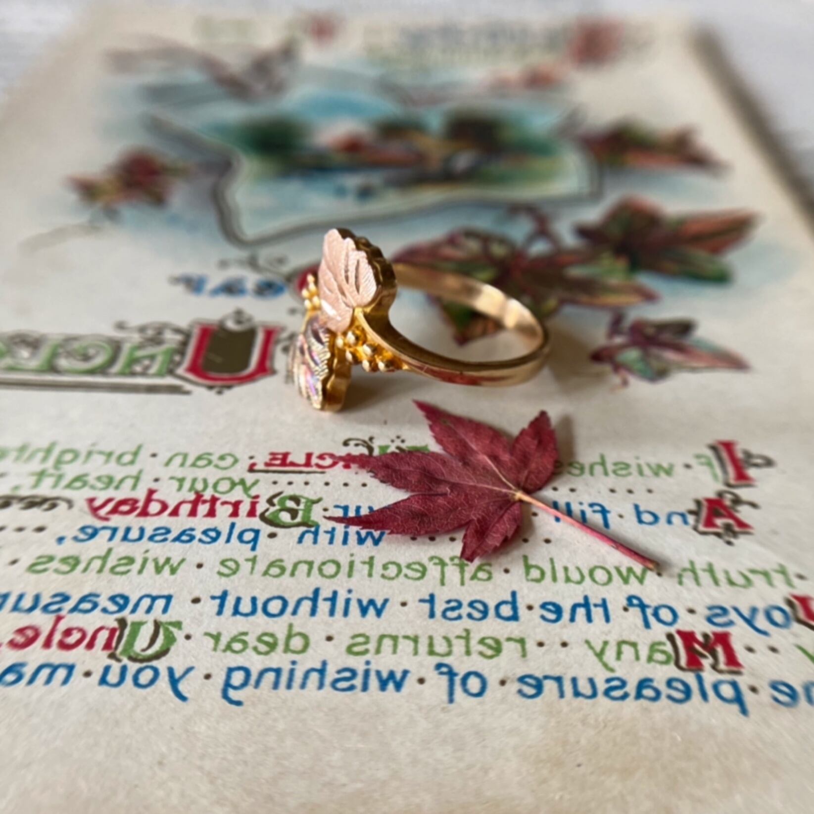 1枚の葉はグリーンゴールドもう1枚はピンクゴールド、ブラックヒルズ特有のサーモンピンクカラーと少し渋めのグリーンゴールドは他のジュエリーでは決して味わう事が出来ない独特の風合いです。