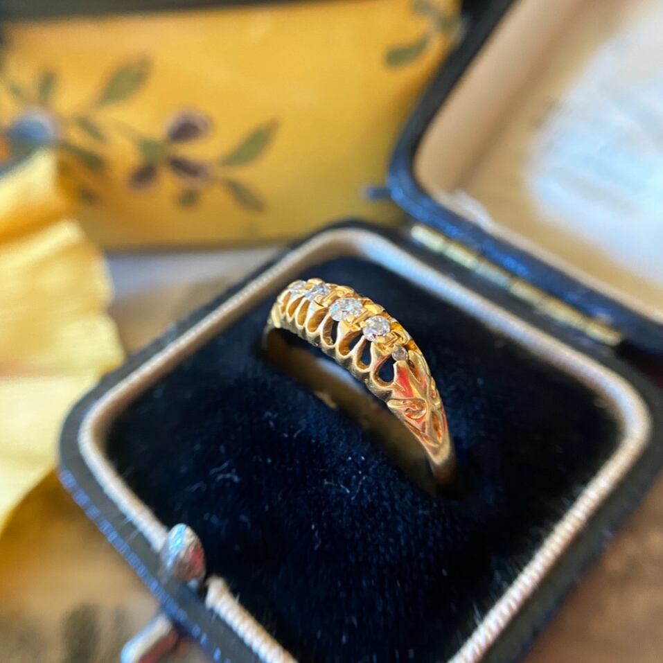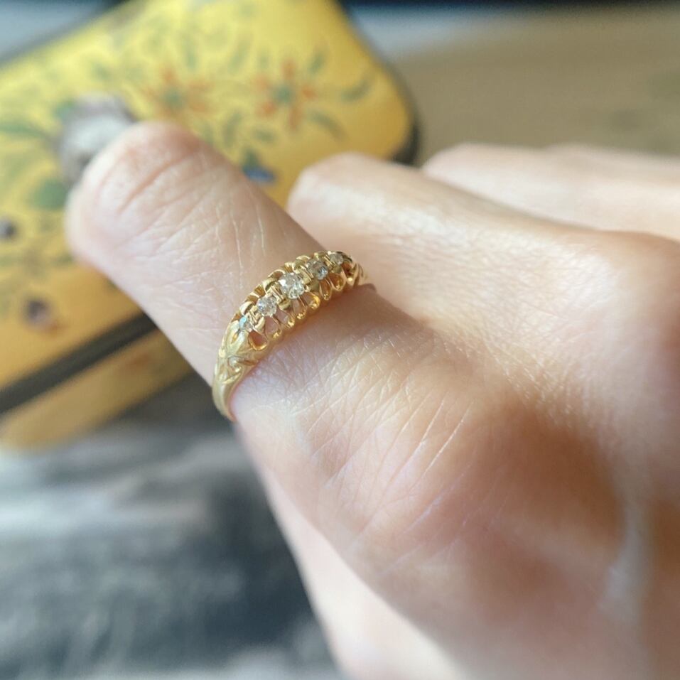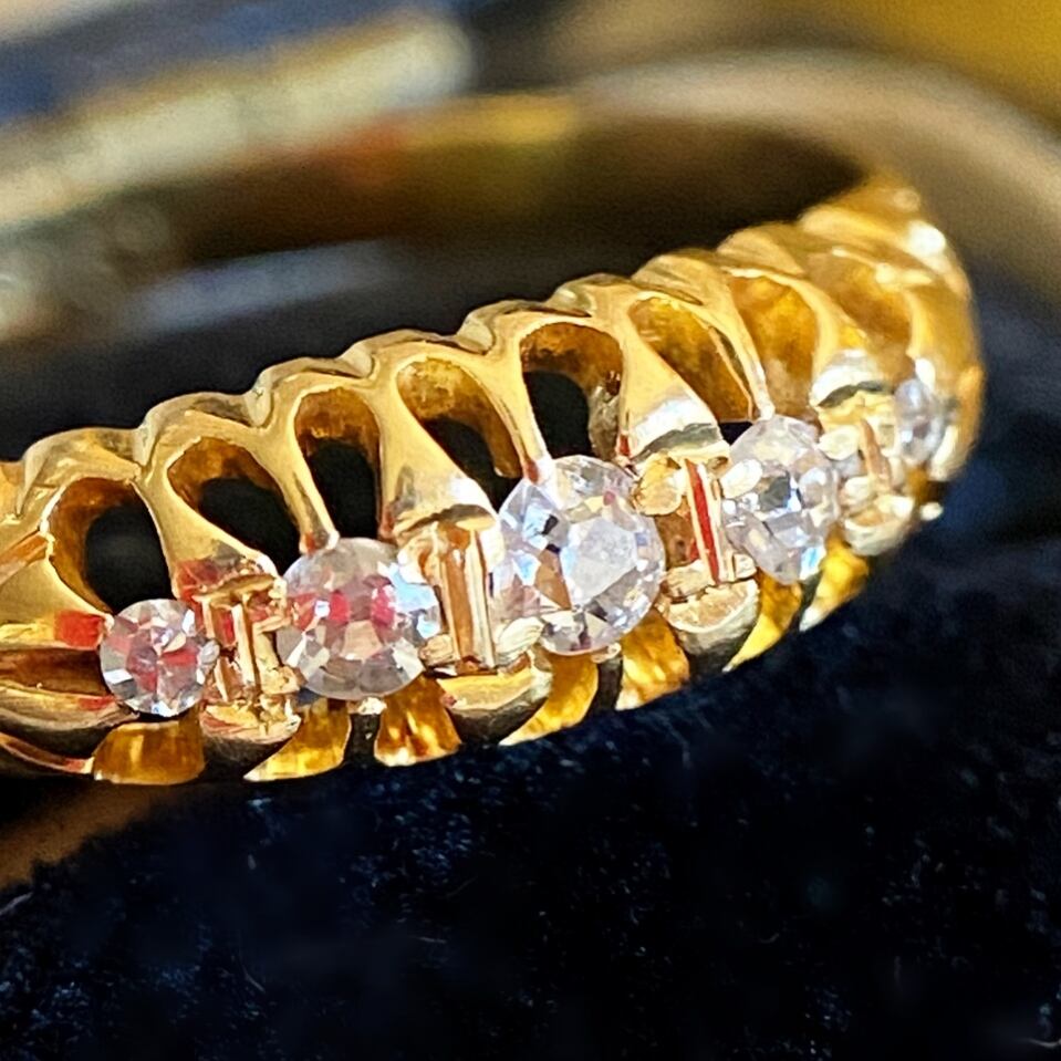 台座は光を多く取り込めるように爪と爪の間は雫型の細工が施され、5石のダイヤモンドは、それぞれが当時のカッターさんによりリズミカルなカットを施され命を吹き込まれた小さくとも透明感のあるオープンキュレットのオールドカットダイヤモンドがセットされ、今のものでは望めない、アンティークらしい穏やかな煌きが、地金の輝きと相まって美しい存在感を放ちます。