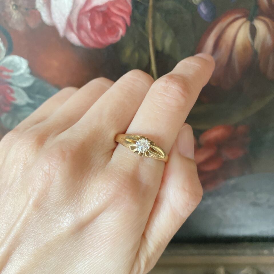 リングのボディーから伸びた爪は同じ一枚のゴールドの板から叩いて作っているからこそ出せる味わい、ショルダーと台座が一体化したデザインがアンティークらしい趣きとなって素敵なひと品です。