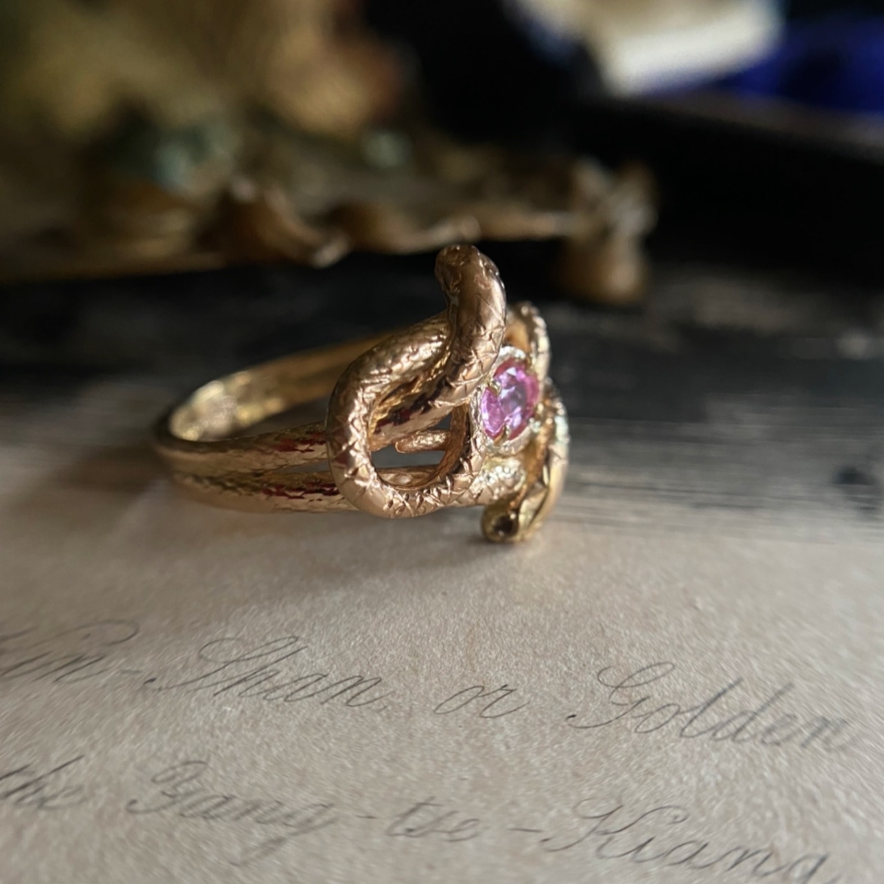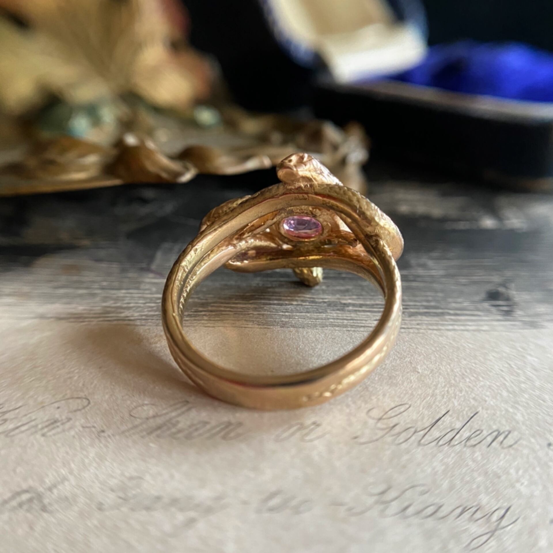 まるで夫婦のように中心の卵に見立てたピンクサファイアを守っているかのようなデザイン、幸福の神蛇 とでもいいましょうか、ただならね存在感が神秘的なひと品です。