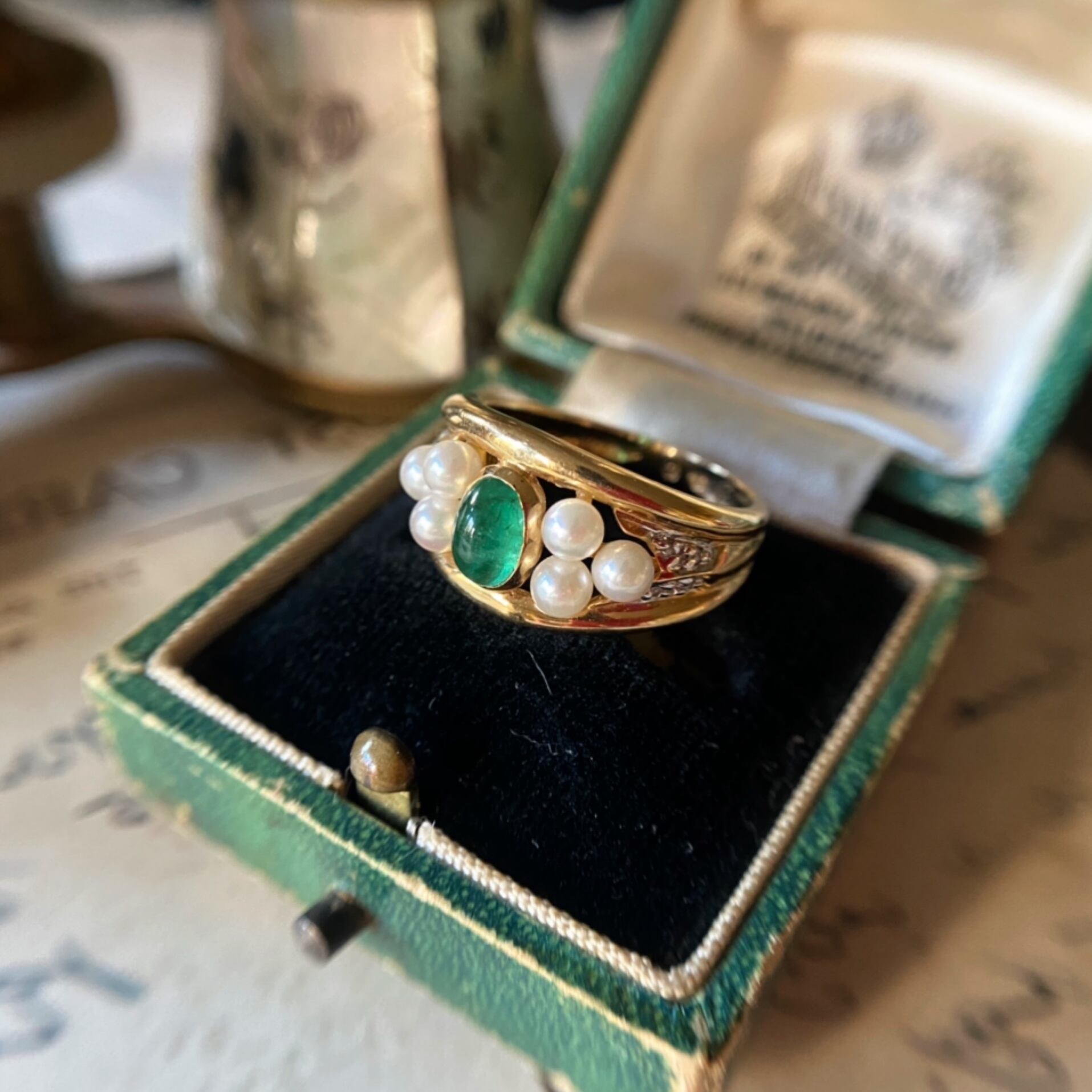 リング全体がコロンとした丸みのあるデザインで、指にそう感じがとても心地よく、エメラルドとパールのなかなか巡り会えないコンビネーションといい、とっておきのひと品です。