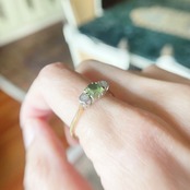 中央に配したぺリドットはまるでグミみたいで、摘むとプニュとなるのではないか?と思ってしまうほどプルンプルン。両隣りにはシングルカットダイヤモンドが後光留めでセットされ、時折キランキランと煌めき、甘い春の香りさえも漂ってきそうな、全体的に清楚で穏やかな佇まいのひと品です。